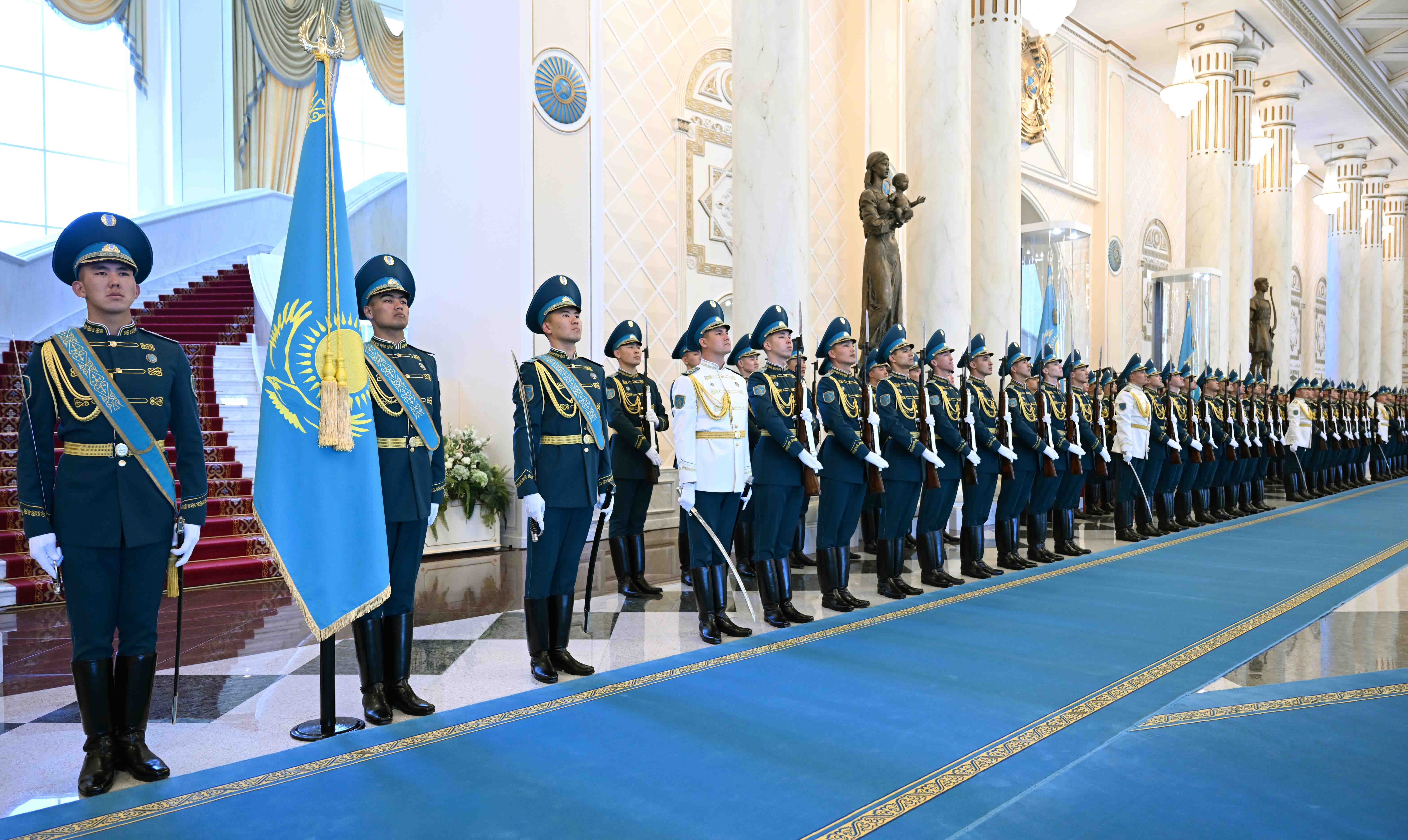 The Kazakh President and the German Chancellor introduced members of their delegations. The Head of the Honor Guard performed a welcome ceremony, followed by the national anthems of the two countries.