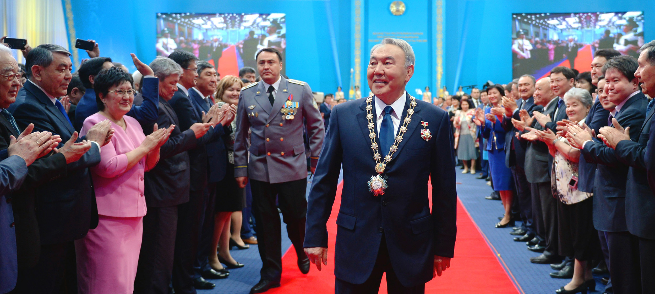 Мемлекет басшысының кортежі «Ақорда» резиденциясынан Тәуелсіздік сарайының басқы есігінің алдына келді. Осы жерде жаңадан сайланған Қазақстан Республикасы Президентіне Мемлекеттік күзет қызметінің бастығы А.Күреңбеков рапорт берді.