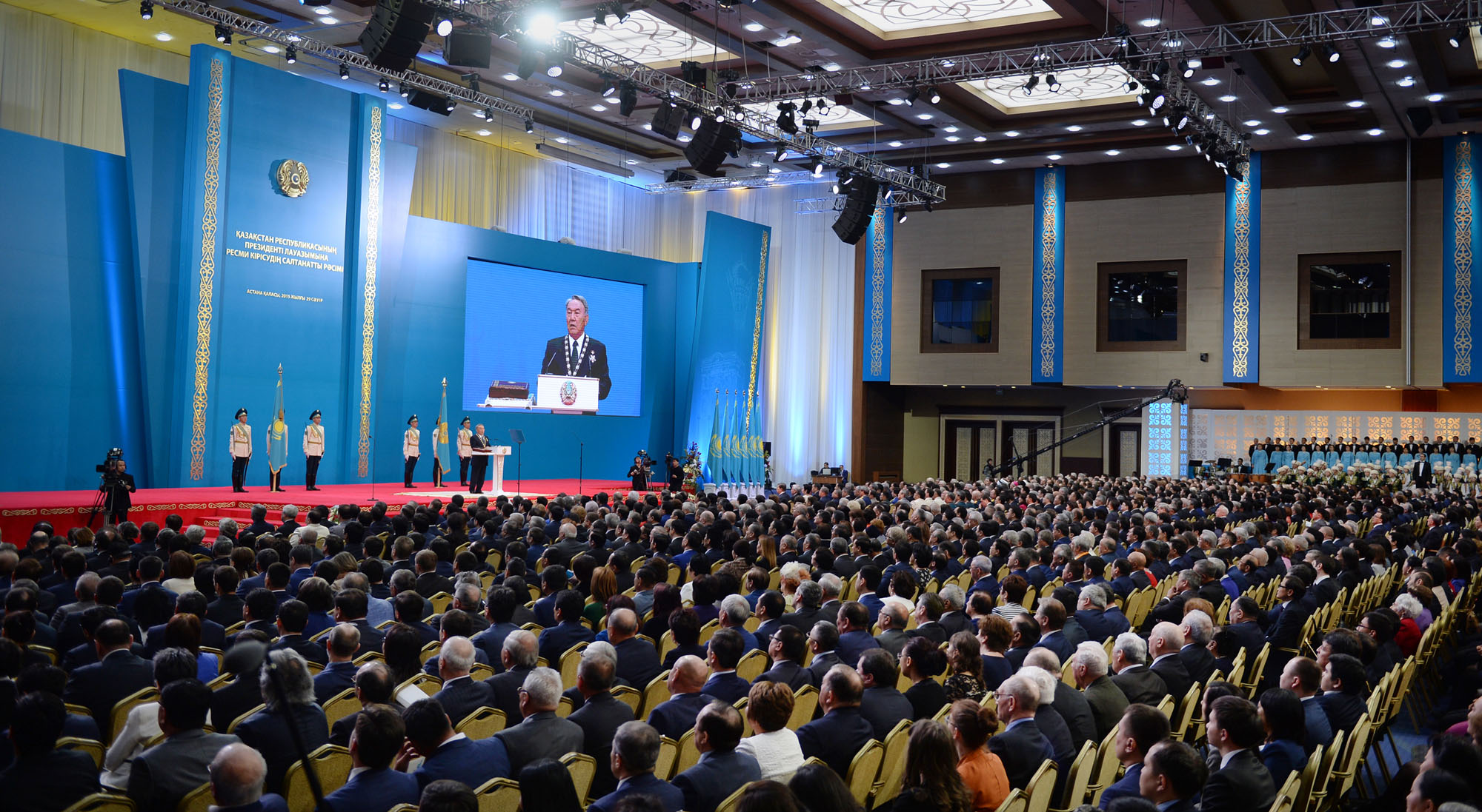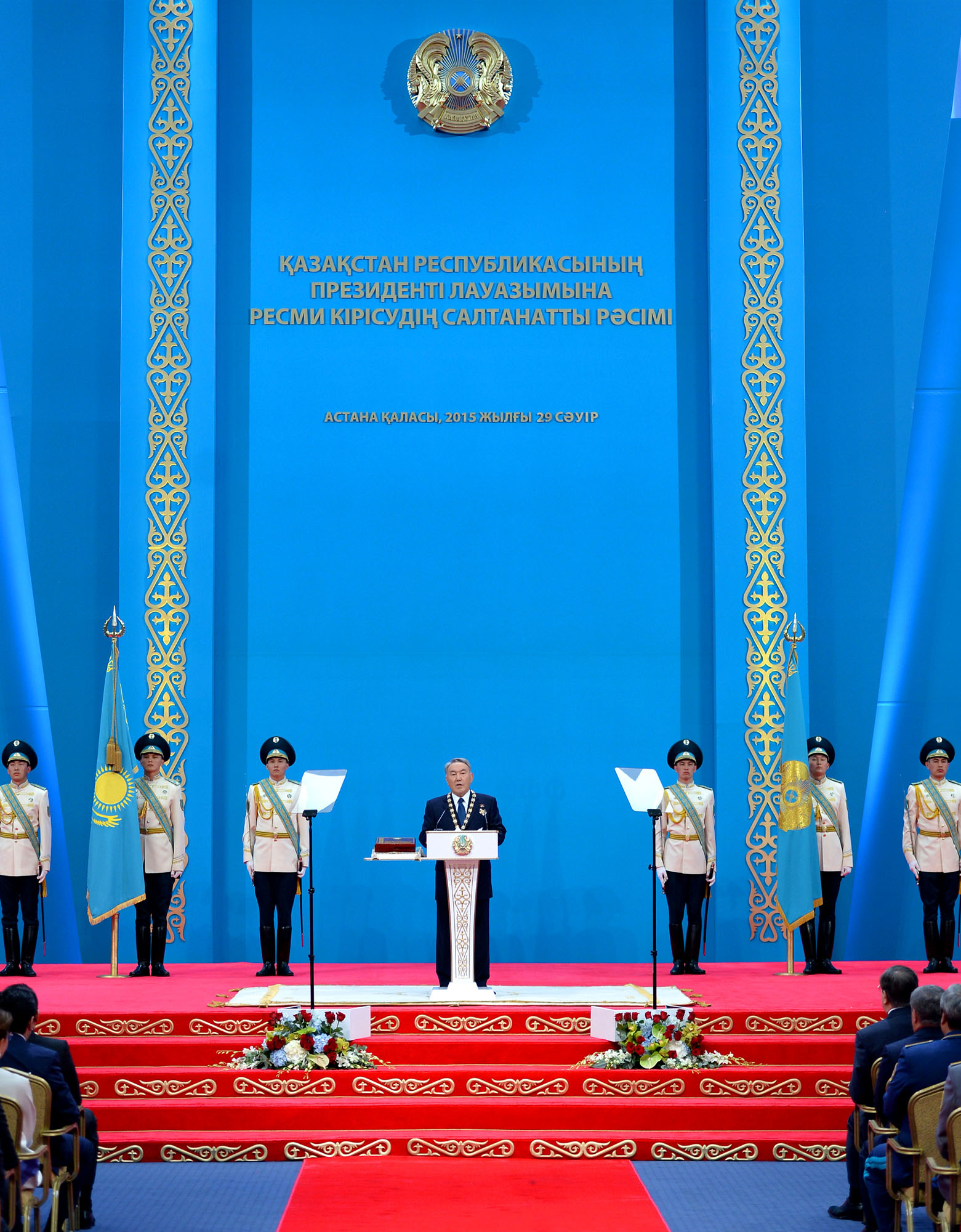 Іс-шара Мемлекеттік Ту мен Президент Байрағының, сондай-ақ Қазақстан Республикасы Конституциясының Тәуелсіздік сарайының Үлкен залына салтанатты жағдайда әкелінуінен басталды.