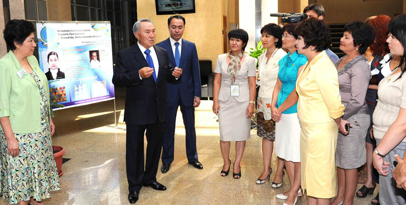 Қазақстан Президенті Зияткерлік мектепті аралау барысында ақпараттық стендпен танысып, оқу орнының педагогикалық ұжымымен және оқушылардың ата-аналарымен кездесті.