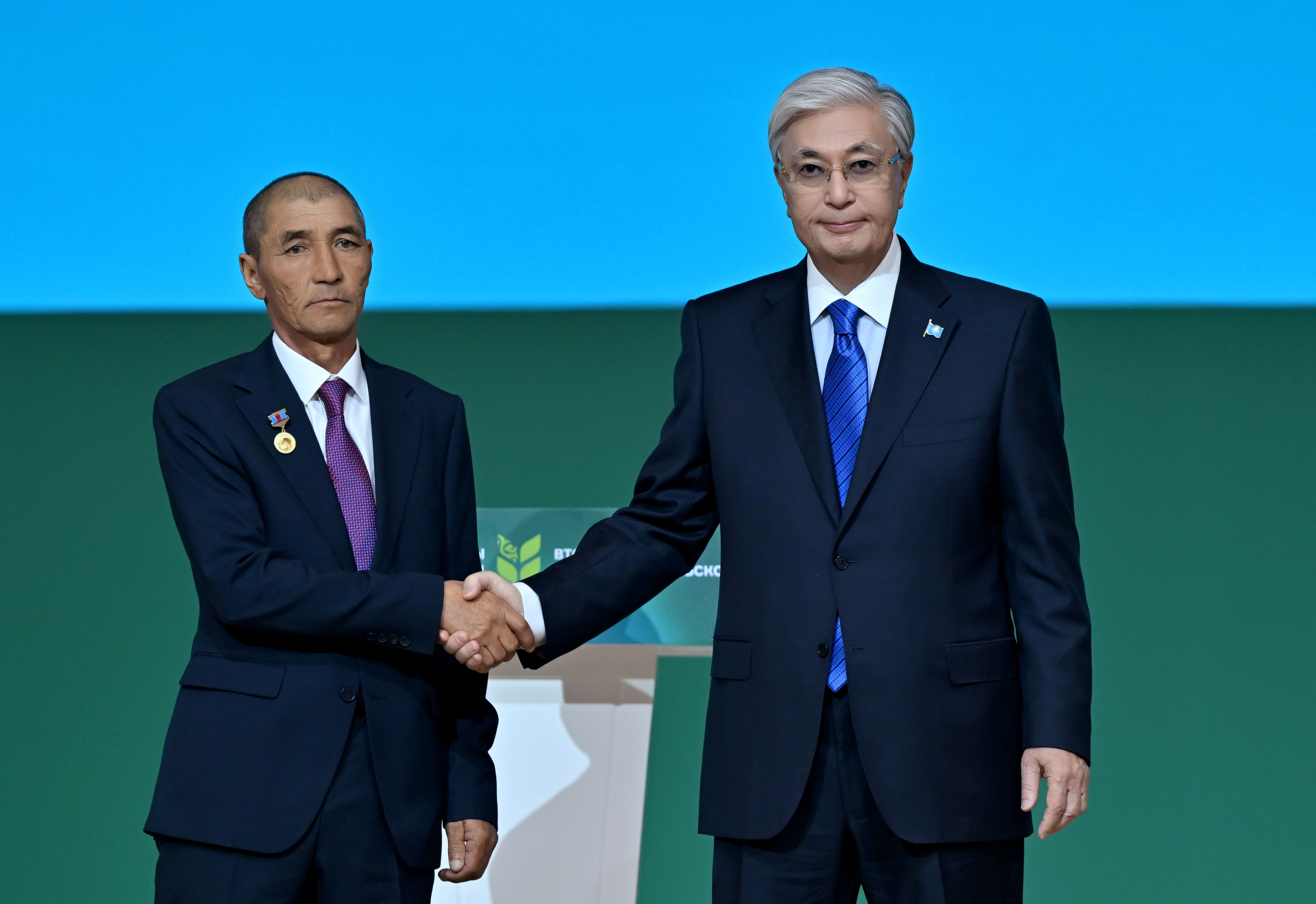 Ауыл шаруашылығы еңбеккерлерінің екінші форумында Жұмысшы мамандықтары жылына орай еңбек адамдарына айрықша құрмет көрсетілді. Мемлекет басшысының Жарлығымен еліміздің агроөнеркәсіп саласын дамытудағы аса үздік жетістіктері үшін «Степное» жауапкершілігі шектеулі серіктестігінің (Ақтөбе облысы) директоры Аманғос Сансызбайұлы Төлеуовке жоғары дәрежелі ерекшелік белгісі – «Қазақстанның Еңбек Ері» атағы берілді. Президент Қасым-Жомарт Тоқаевтың қолынан ауыл шаруашылығы саласының 30 еңбеккері мемлекеттік награда алды Атап айтқанда, бір адам – «Парасат» орденінің кавалері, саланың 6 өкілі «Құрмет» орденінің иегері атанды. II дәрежелі «Еңбек даңқы» орденімен 1 азамат, III дәрежелі «Еңбек даңқы» орденімен 10 адам, «Ерен еңбегі үшін» медалімен 6 еңбеккер марапатталды. Сондай-ақ бүгінгі іс-шарада «Қазақстанның аграрлық саласының еңбек сіңірген қайраткері» құрметті атағы ауыл шаруашылығы саласында озат атанған төрт азаматқа алғаш рет тапсырылды.
