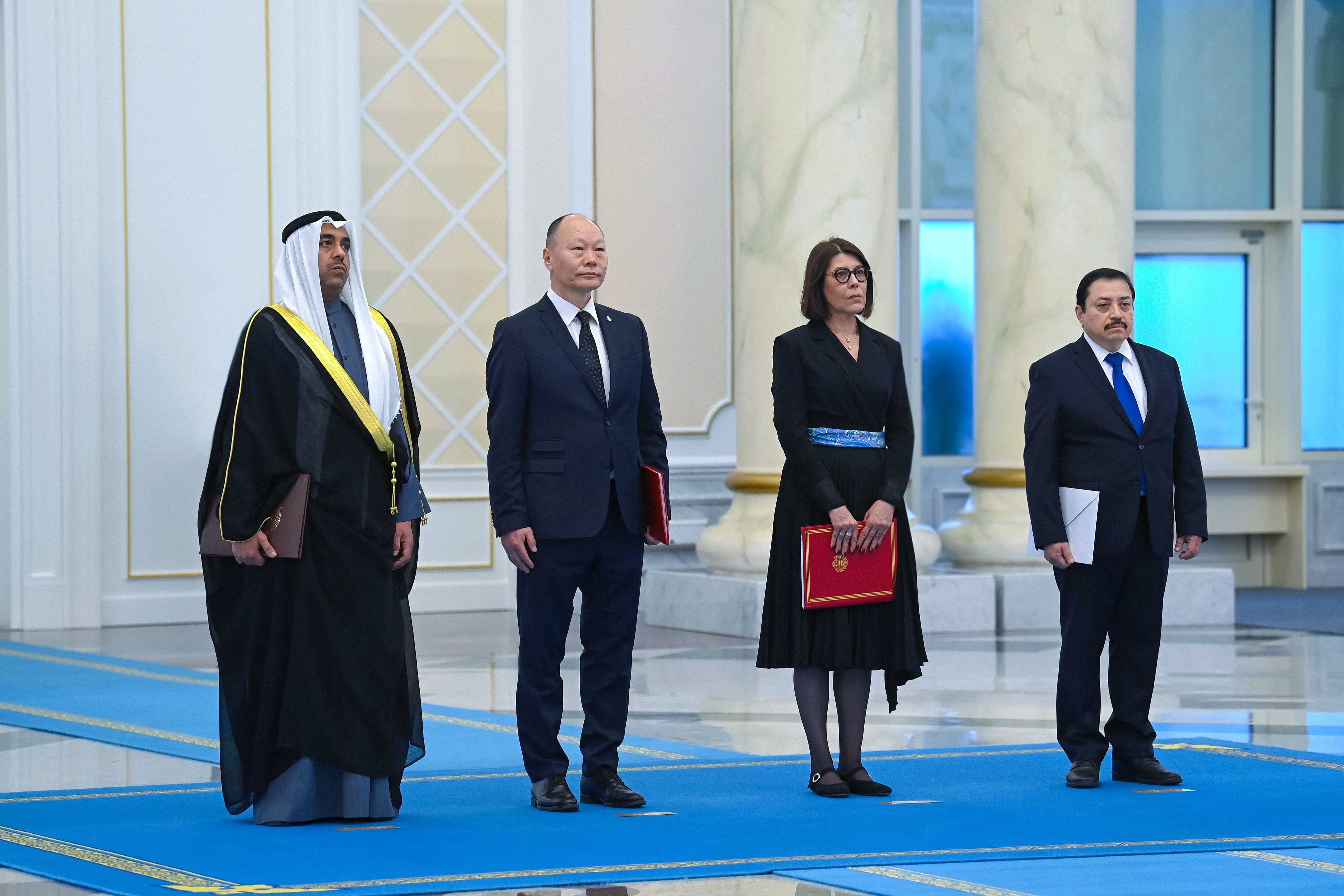 Сенім грамоталарын Кувейт Мемлекетінің елшісі Адель Ахмед Сулайман Әл Гунайман, Моңғолия елшісі Гунаажавын Батжаргал, Монако Княздігінің елшісі Мирей Мартини және Эль-Сальвадор Республикасының елшісі Юрий Павел Сантакрус Пердомо тапсырды.