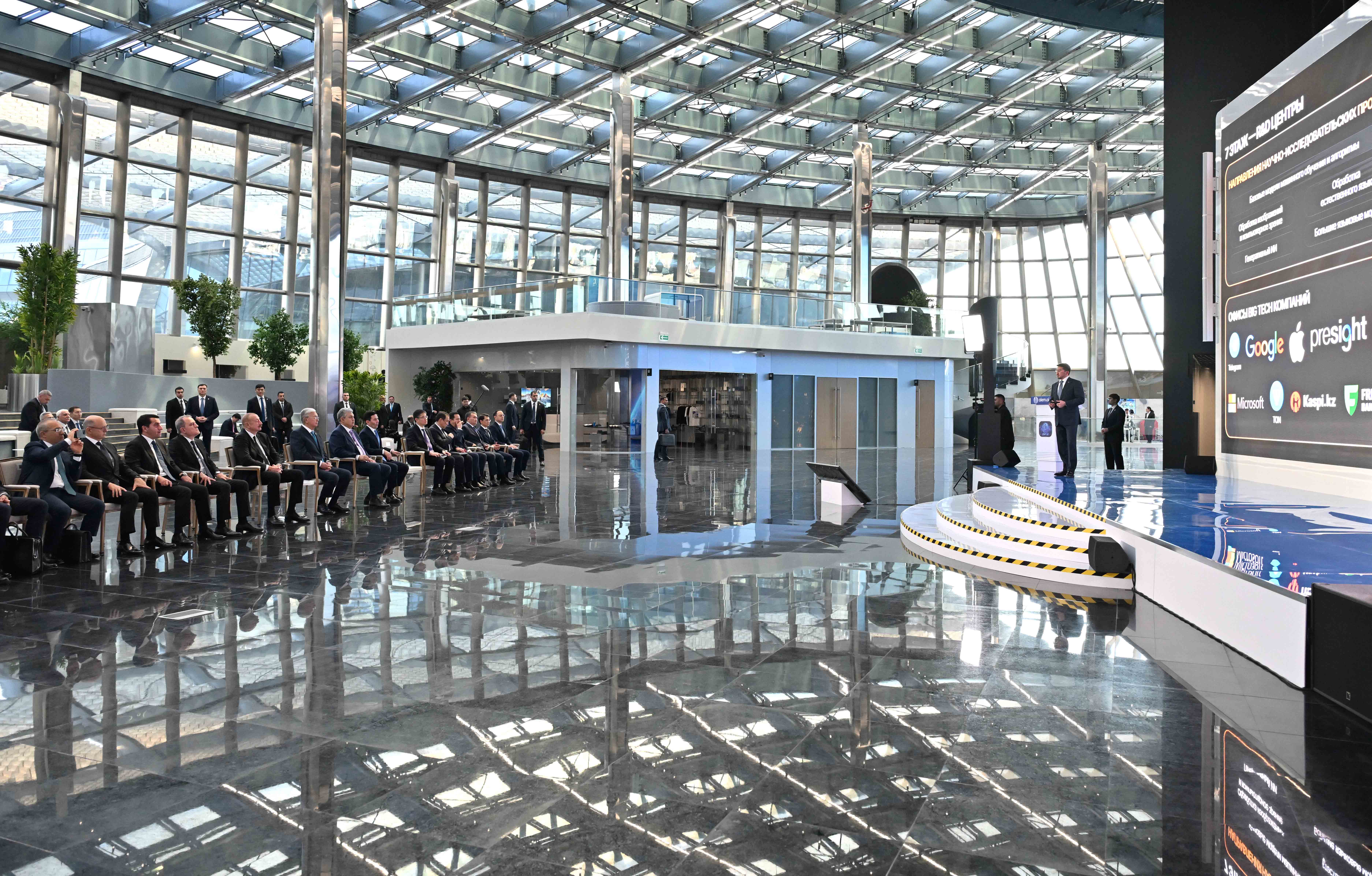Орталықта Қасым-Жомарт Тоқаев пен Ильхам Әлиев цифрлық технологияларды дамыту және жасанды интеллектіні қолдану жетістіктерімен танысты. Премьер-министрдің орынбасары – Жасанды интеллект және цифрлық даму министрі Жаслан Мәдиев мәртебелі меймандарға мемлекеттік үдерістерді басқаруға және талдауға, сондай-ақ GovTech-шешімдер қабылдауға арналған AI-Driven Government ахуалдық орталығының тұжырымдамасы жөнінде баяндады. Сонымен қатар мемлекеттер басшыларына Smart City технологиялары, роботты техника аймағы, түрлі салаға жасанды интеллектіні енгізуге бағытталған Samruk-Kazyna жобалары көрсетілді. Президенттер Astana Hub инновациялық кластерін аралап көрді. Орталықта 1800-ден астам IT-компания мен стартап, оның ішінде шетелдің үлесі бар 460-тан аса компания тіркелген. Бұдан бөлек, Қасым-Жомарт Тоқаев пен Ильхам Әлиевке халықаралық нарыққа шыққан қазақстандық компаниялардың өнімдері жайында мәлімет берілді.