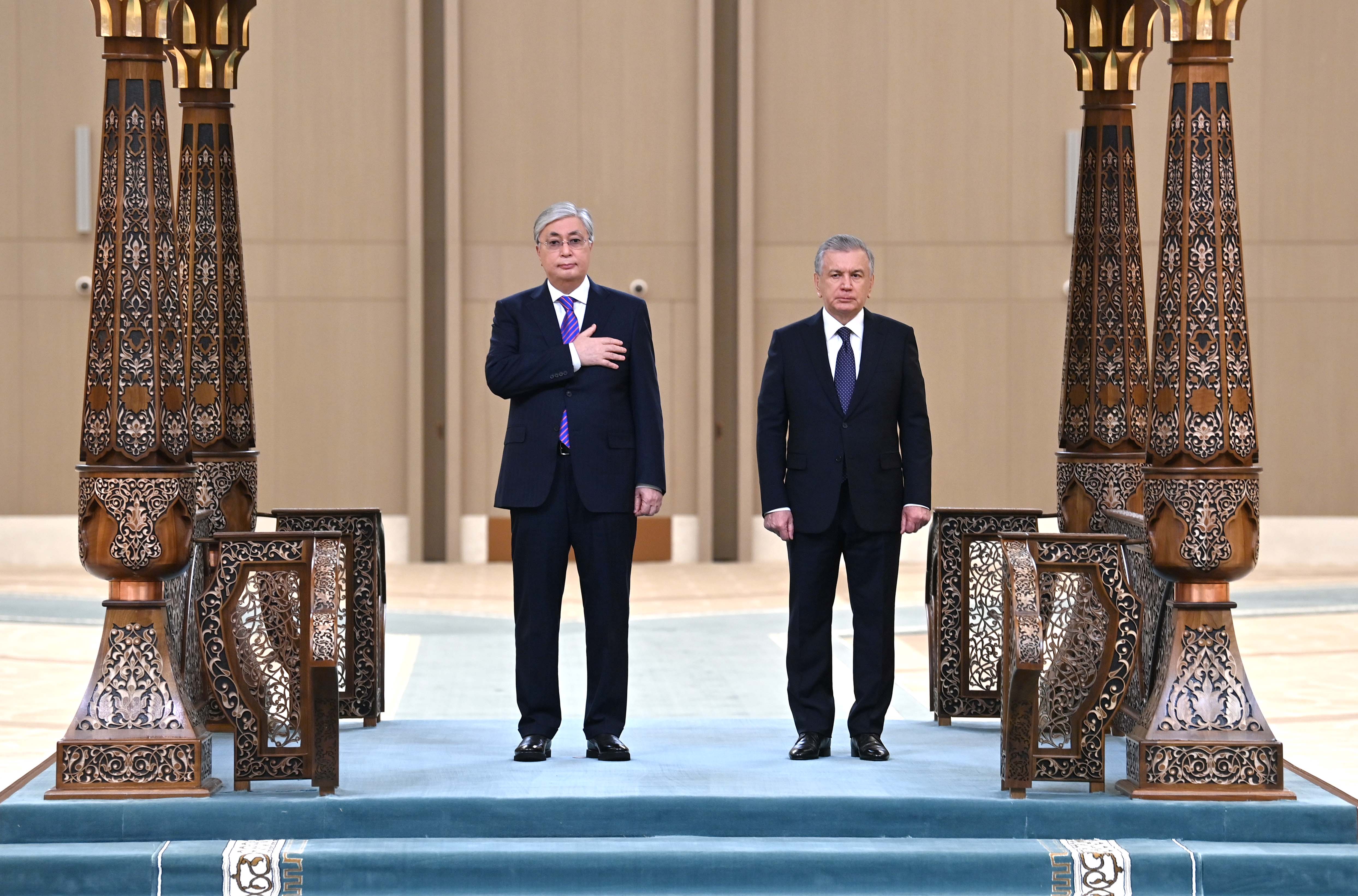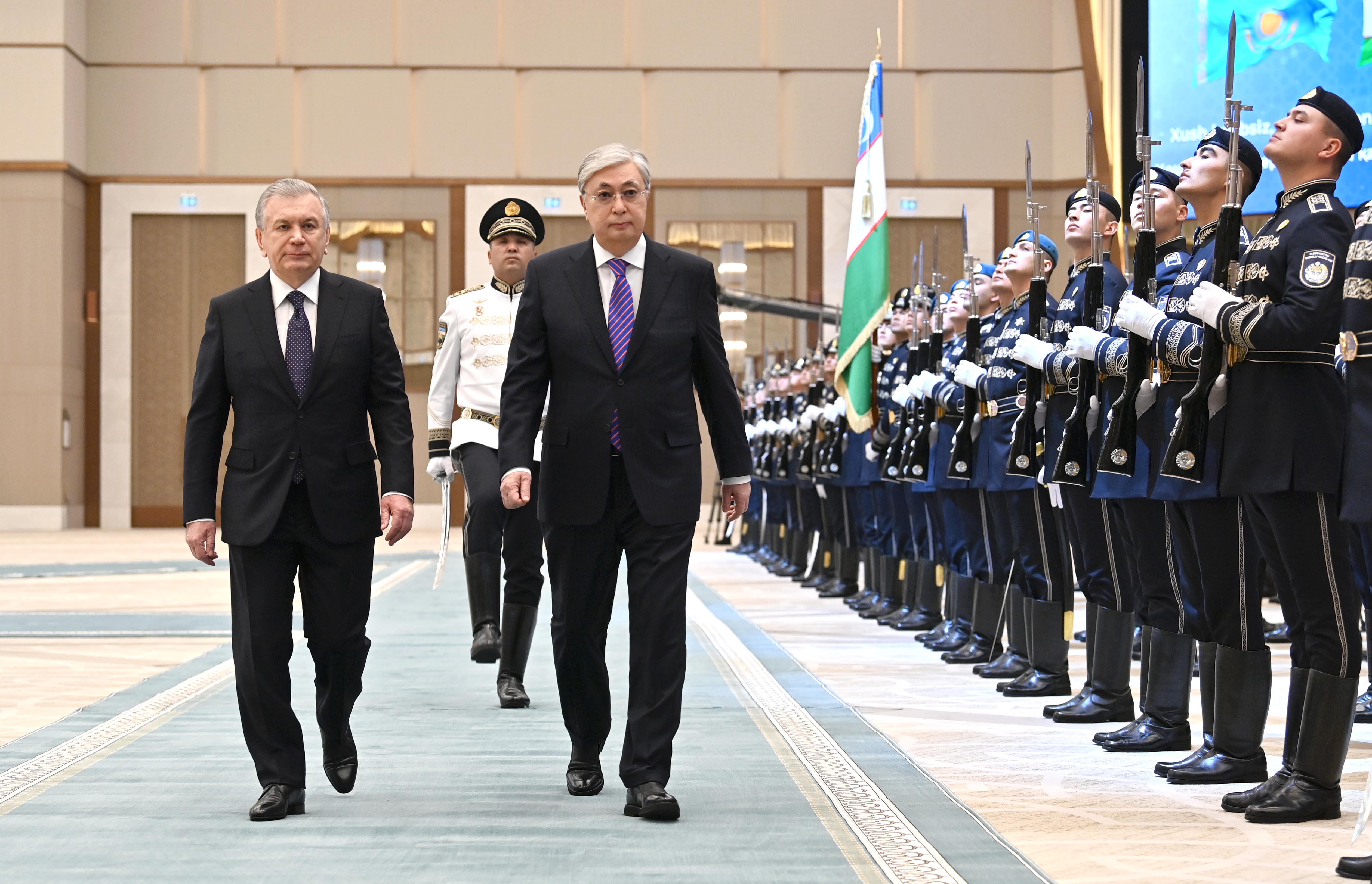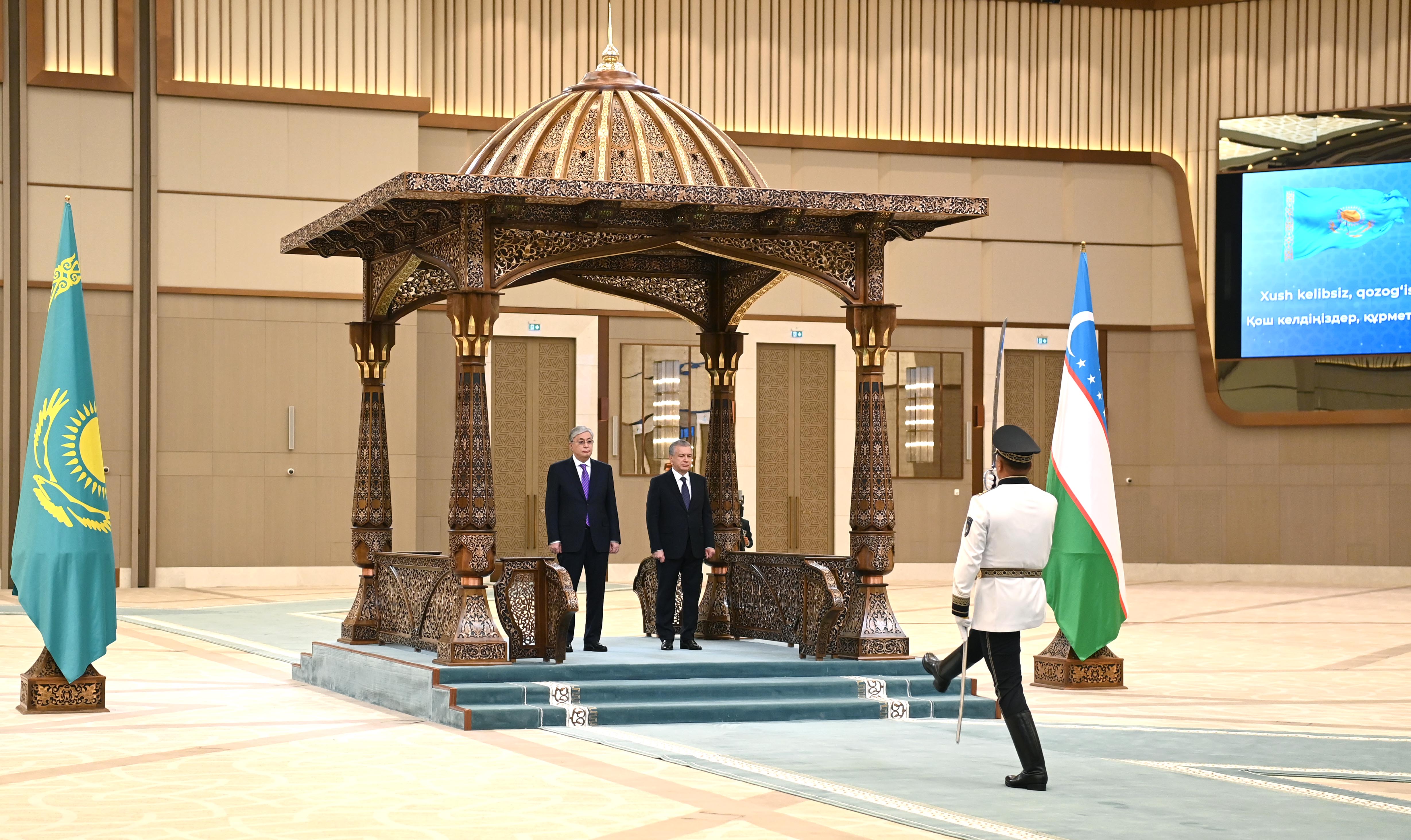 Президент Қасым-Жомарт Тоқаевты халықаралық конгресс орталығында ресми қарсы алу рәсімі өтті. Содан кейін құрмет қарауылының бастығы екі ел басшыларына рапорт беріп, Қазақстан мен Өзбекстанның әнұрандары орындалғаннан кейін Қасым-Жомарт Тоқаев пен Шавкат Мирзиёев бір-біріне ресми делегациялардың құрамын таныстырды.