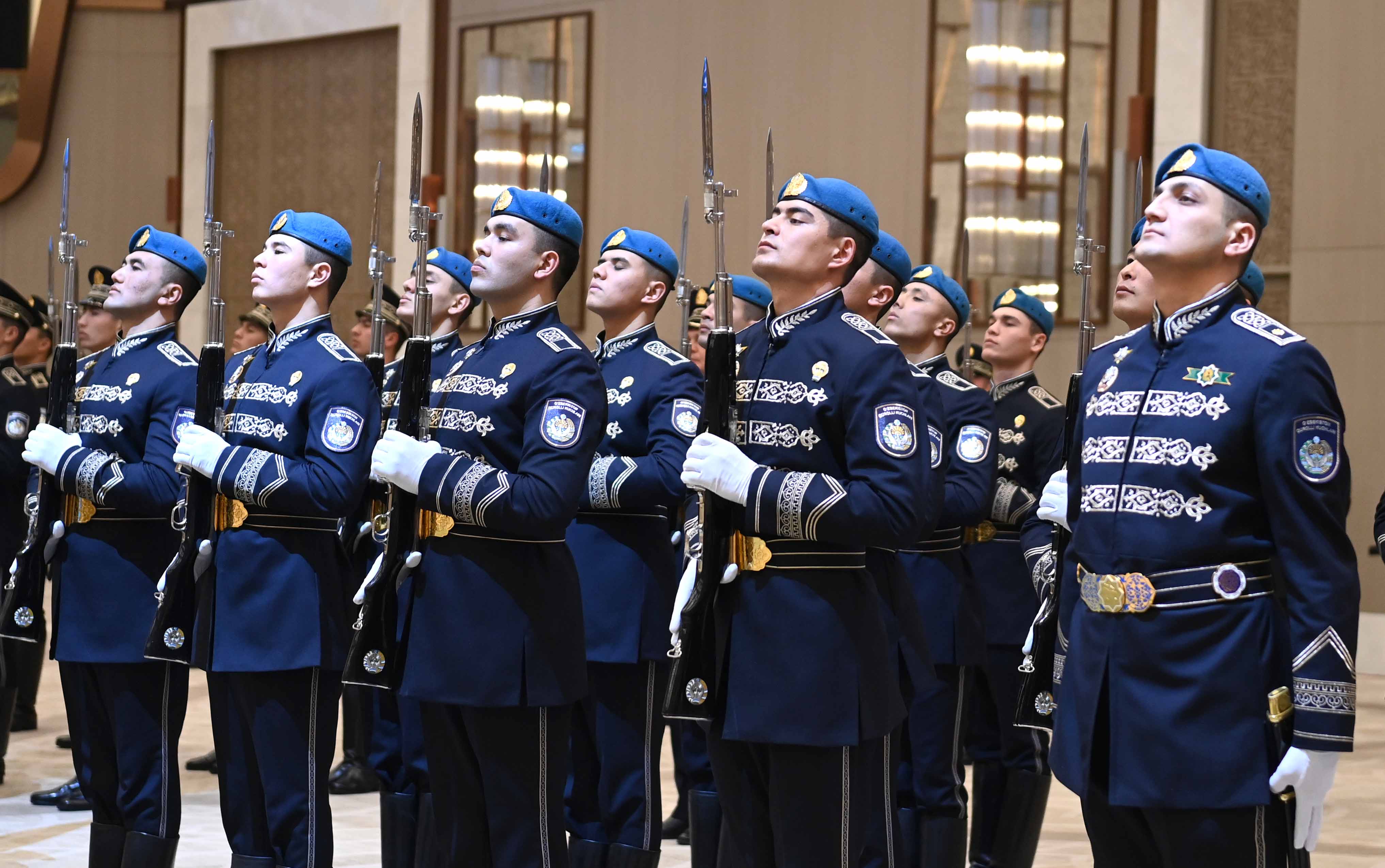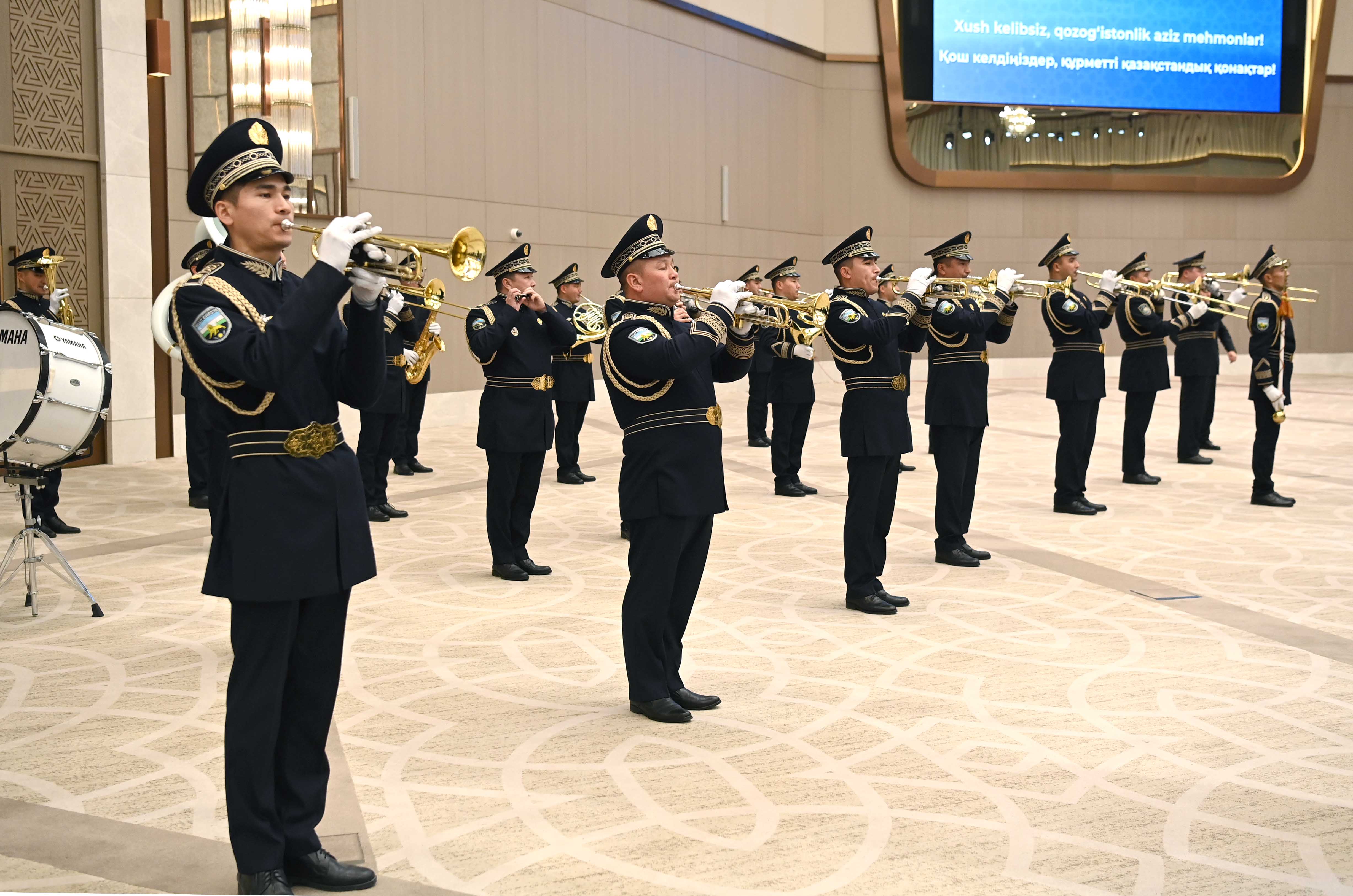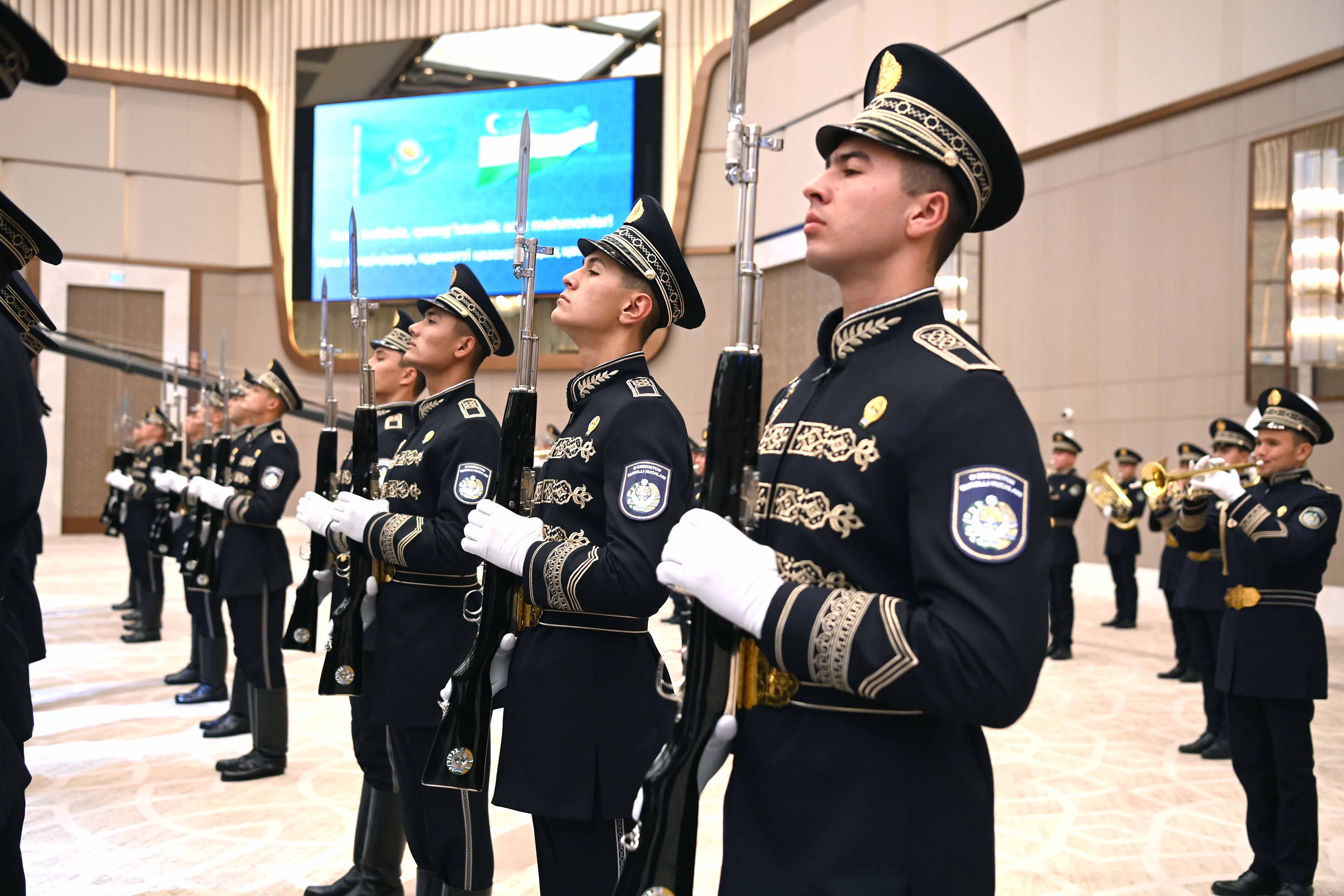 Президент Қасым-Жомарт Тоқаевты халықаралық конгресс орталығында ресми қарсы алу рәсімі өтті. Содан кейін құрмет қарауылының бастығы екі ел басшыларына рапорт беріп, Қазақстан мен Өзбекстанның әнұрандары орындалғаннан кейін Қасым-Жомарт Тоқаев пен Шавкат Мирзиёев бір-біріне ресми делегациялардың құрамын таныстырды.