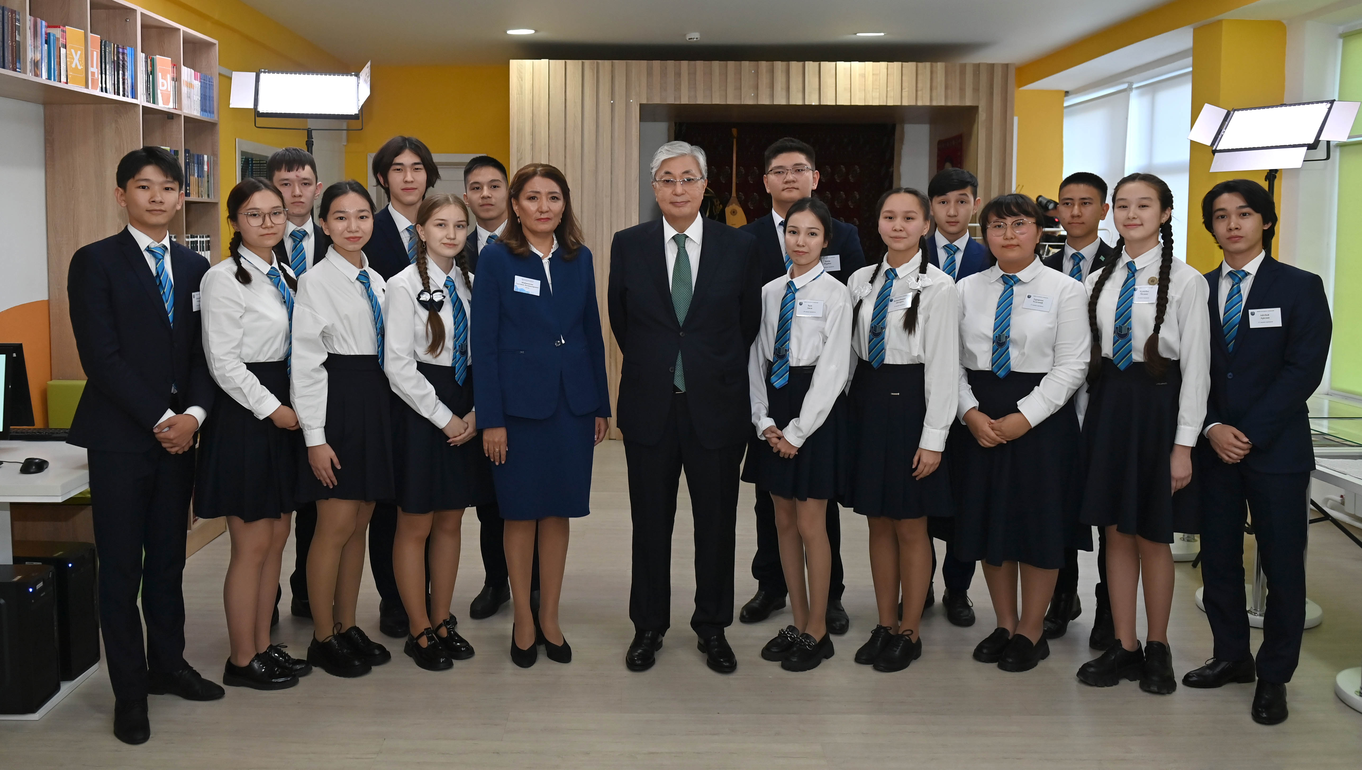 Мектеп директоры Салтанат Шабажанова Қасым-Жомарт Тоқаевқа оқу орнының терең тарихы туралы ақпарат беріп, гимназияның жаңартылған кабинеттерін көрсетті.