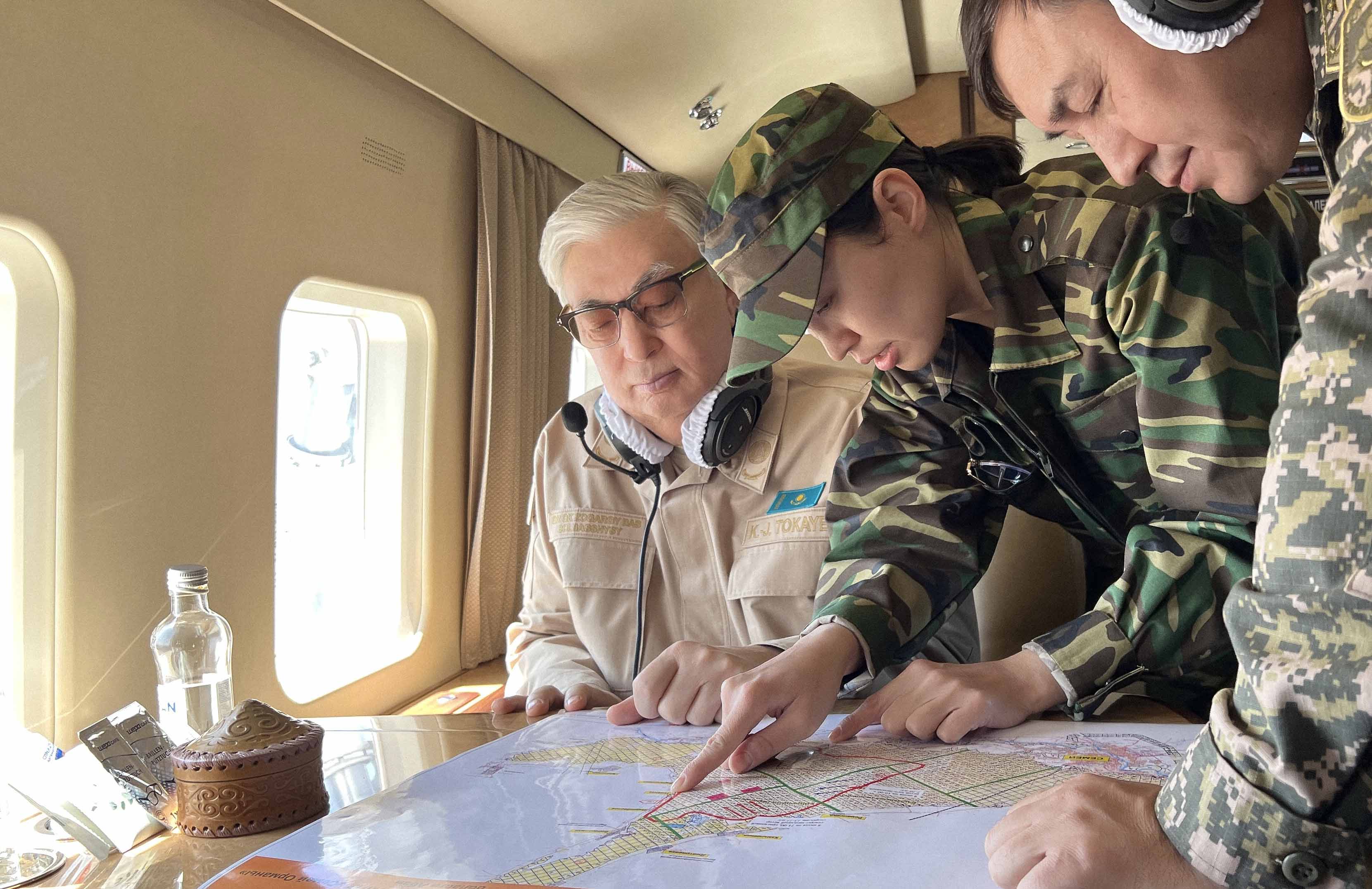 Президент Абай облысына жұмыс сапарымен келіп, өртеніп жатқан орман алқабын тікұшақпен аралап шықты.