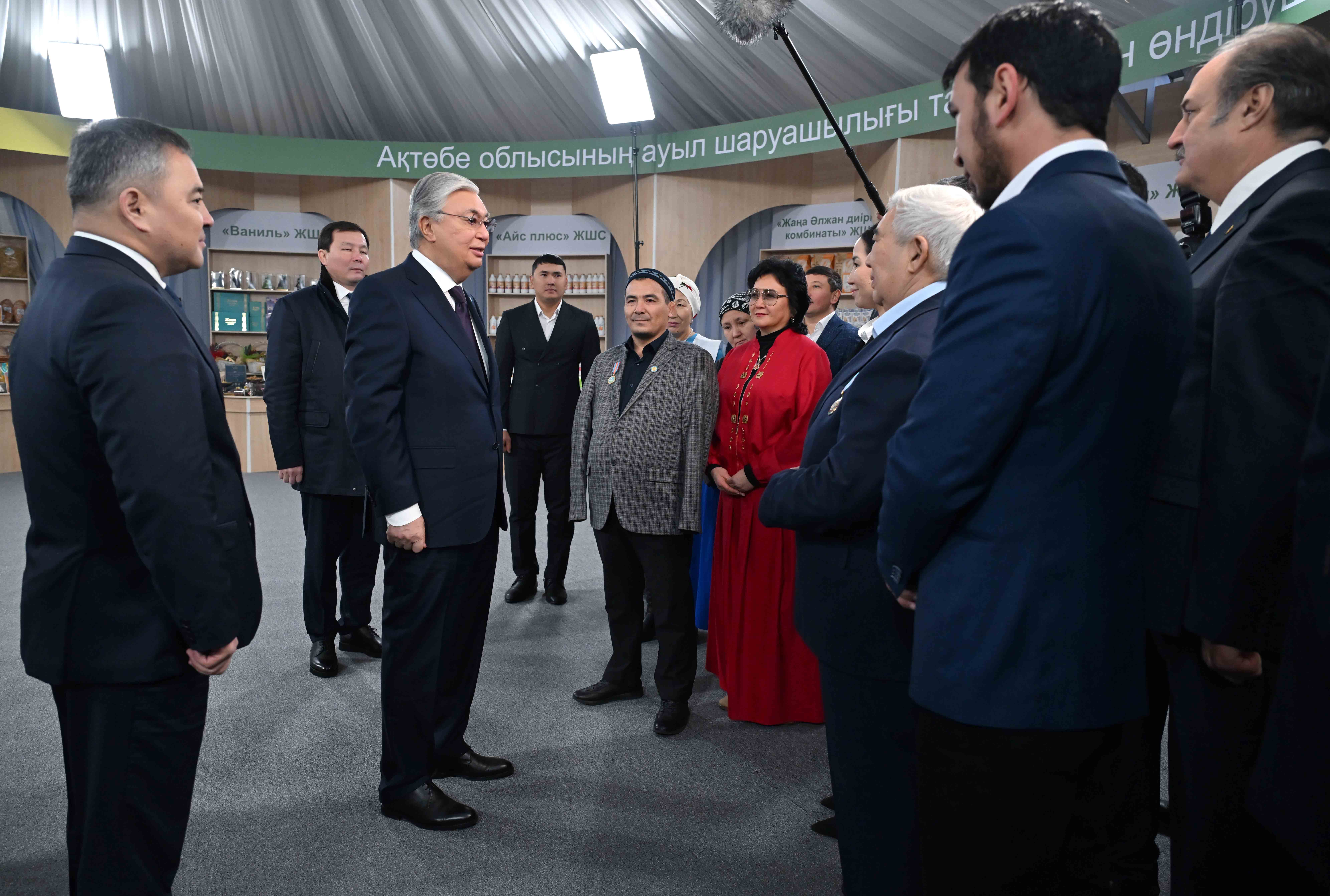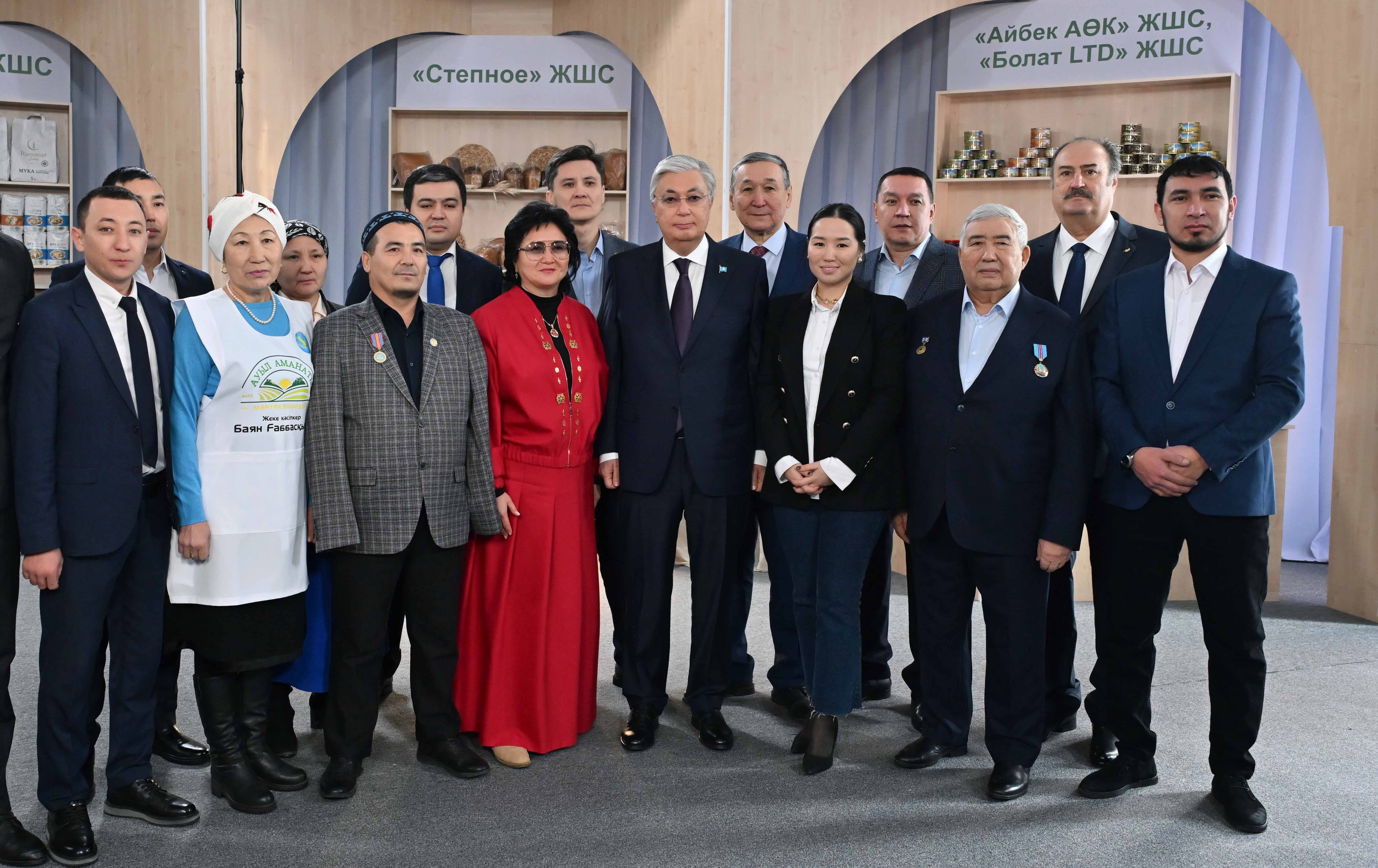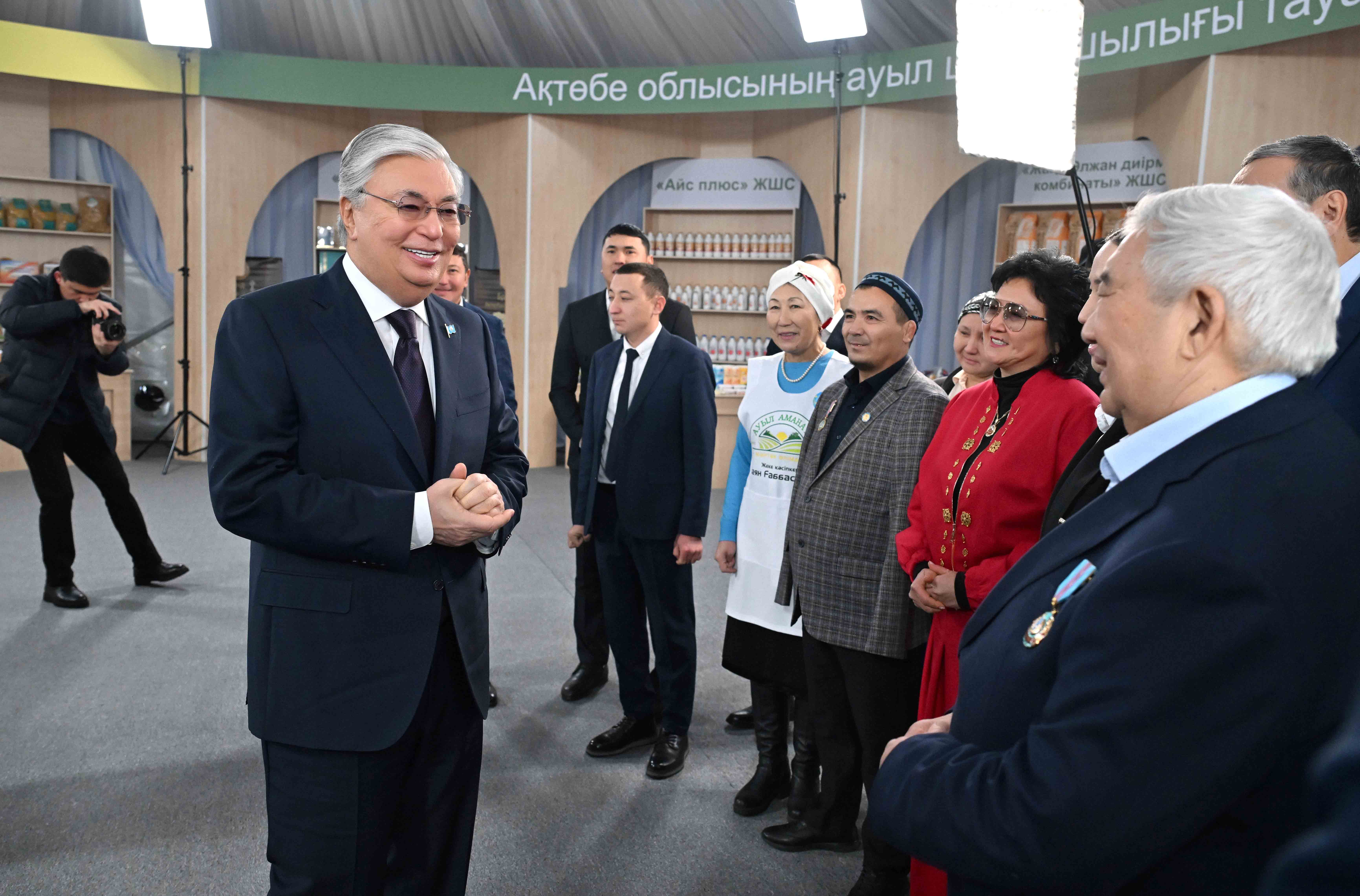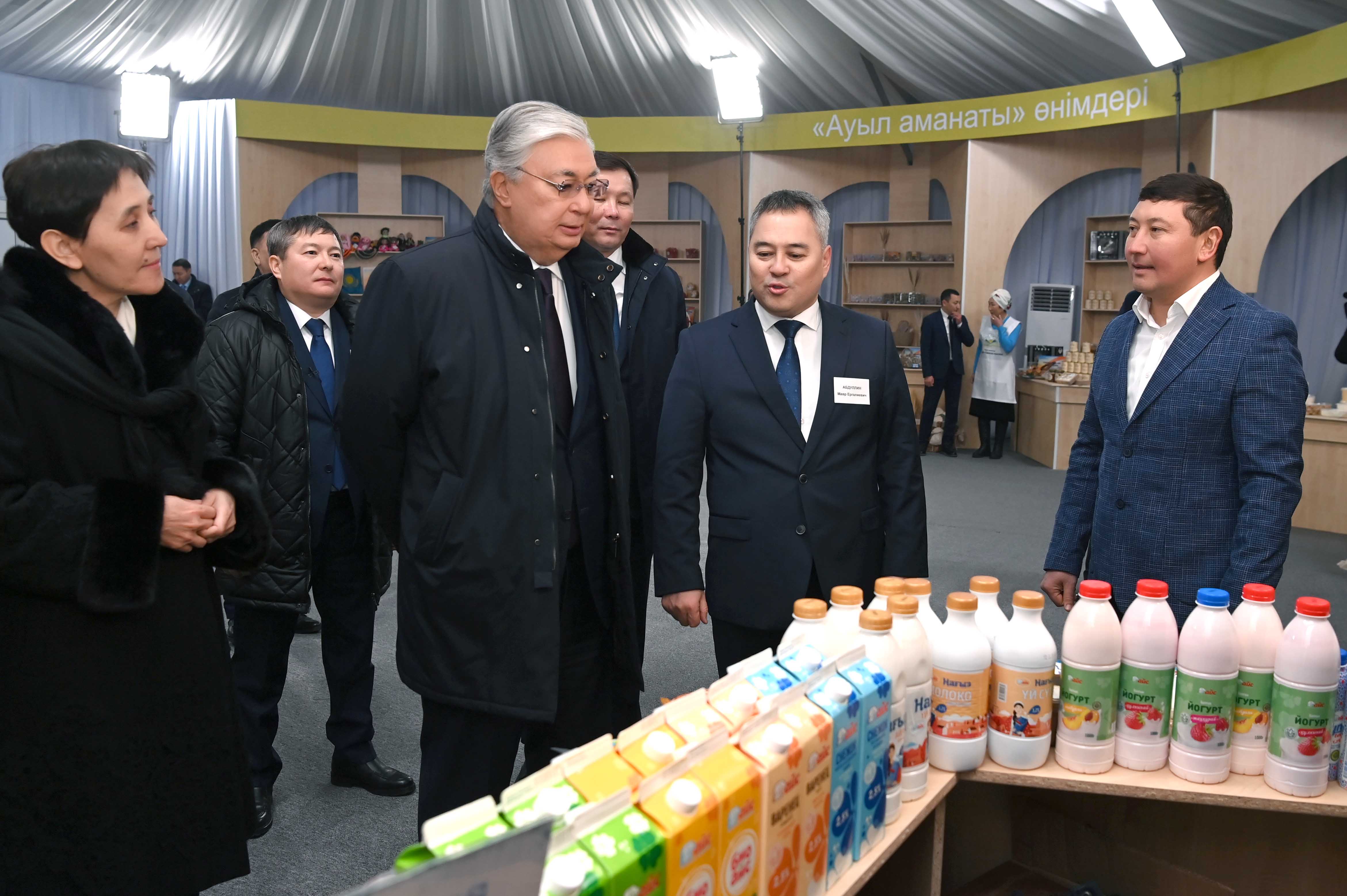 Қасым-Жомарт Тоқаев «Ауыл аманаты» бағдарламасы аясында іске асырылған жобалармен және аймақтағы ауыл шаруашылығы тауарын өндірушілердің өнімдерімен танысқаннан кейін жергілікті кәсіпкерлермен әңгімелесті.