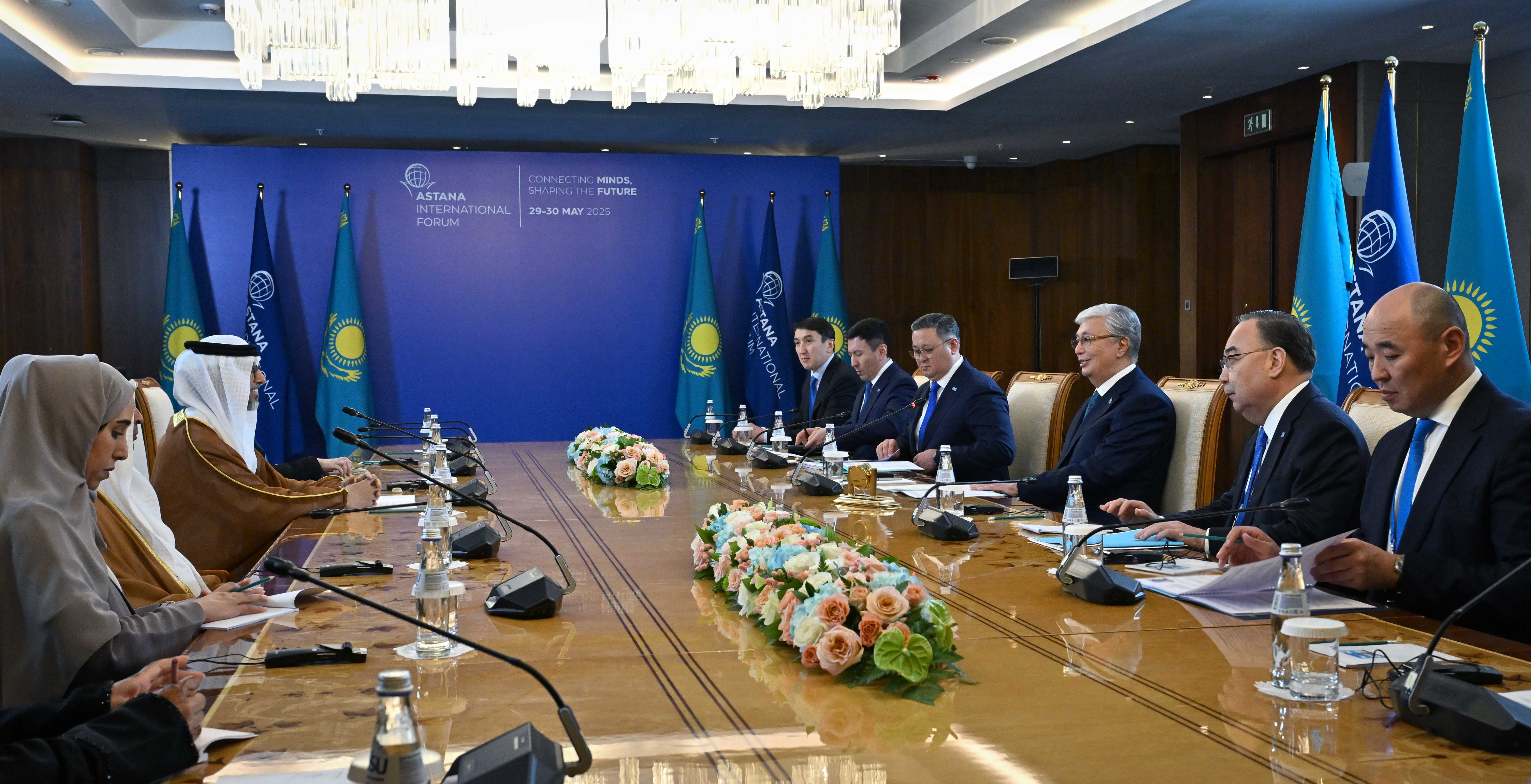 Астана халықаралық форумының алаңында Қасым-Жомарт Тоқаев Біріккен Араб Әмірліктерінің Энергетика және инфрақұрылым министрі Сухейл әл-Мазруимен кездесті. Мемлекет басшысы Абу Дабидің Тақ мұрагері Халед бен Мұхаммед бен Заид Әл Нахаянмен Астанадағы кездесуін ықыласпен еске алды. Оның аясында нәтижелі келіссөздер жүргізіліп, жалпы құны 5 миллиард долларды құрайтын 20-дан астам коммерциялық келісімге қол қойылды. Сухейл әл-Мазруи Астана халықаралық форумының жоғары деңгейде ұйымдастырылғанын атап өтіп, қонақжайлық танытқаны үшін Қазақстан тарапына алғыс айтты. Қасым-Жомарт Тоқаев пен Сухейл әл-Мазруи жоғары деңгейде жасалған уағдаластықтарды жүзеге асырудың нақты жолдарын, соның ішінде екіжақты тауар айналымын 1 миллиард долларға дейін ұлғайту бастамасын талқылады. Министрдің айтуынша, Әмірліктер Абу Даби Тақ мұрагерінің Қазақстанға сапары кезінде қол қойылған келісімдерді орындауға белсене кірісіп кеткен. Кездесу барысында энергетика, ауыл шаруашылығы және көлік салаларындағы ықпалдастықтың өзекті мәселелері қарастырылды.