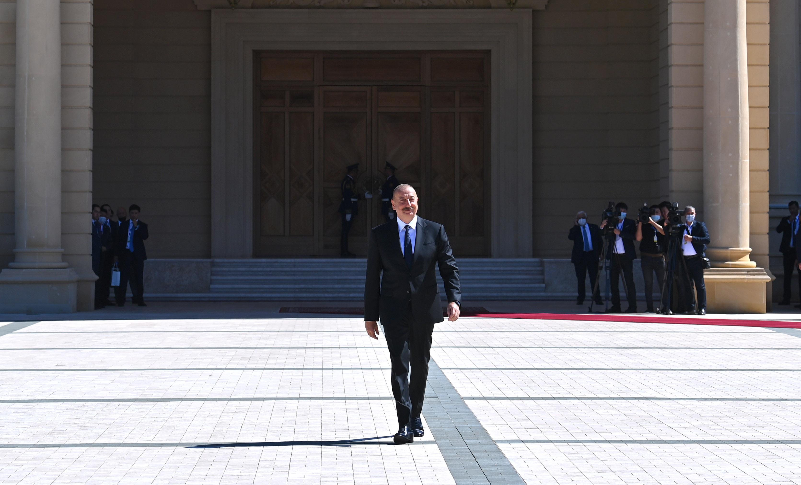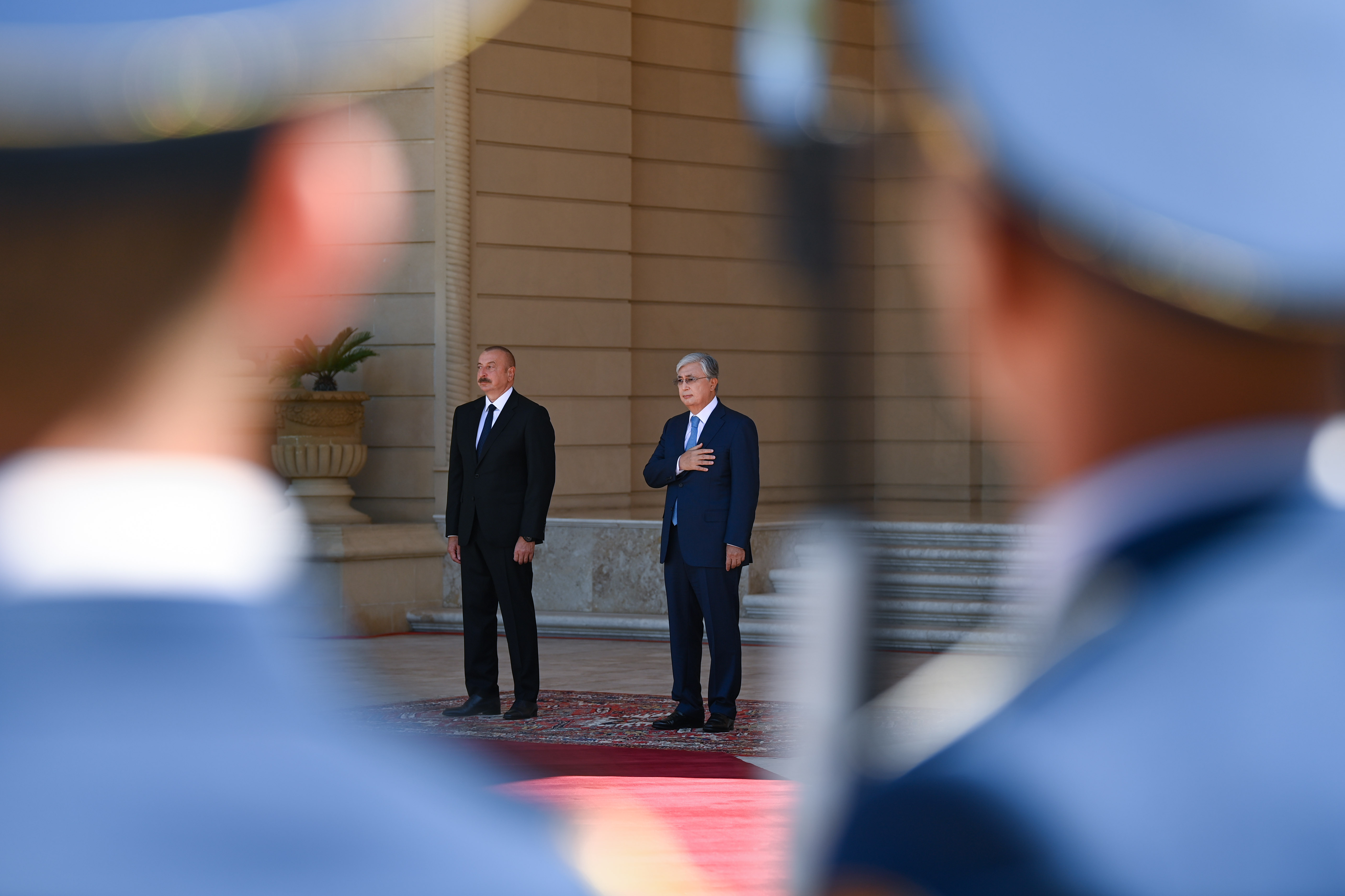 Құрмет Қарауылының бастығы екі ел басшыларына рапорт беріп, Қазақстан мен Әзербайжанның әнұрандары орындалғаннан кейін Қасым-Жомарт Тоқаев пен Ильхам Әлиев бір-біріне ресми делегациялардың құрамын таныстырды. Салтанатты рәсімнен соң екі ел президенттері келіссөз жүргізді.