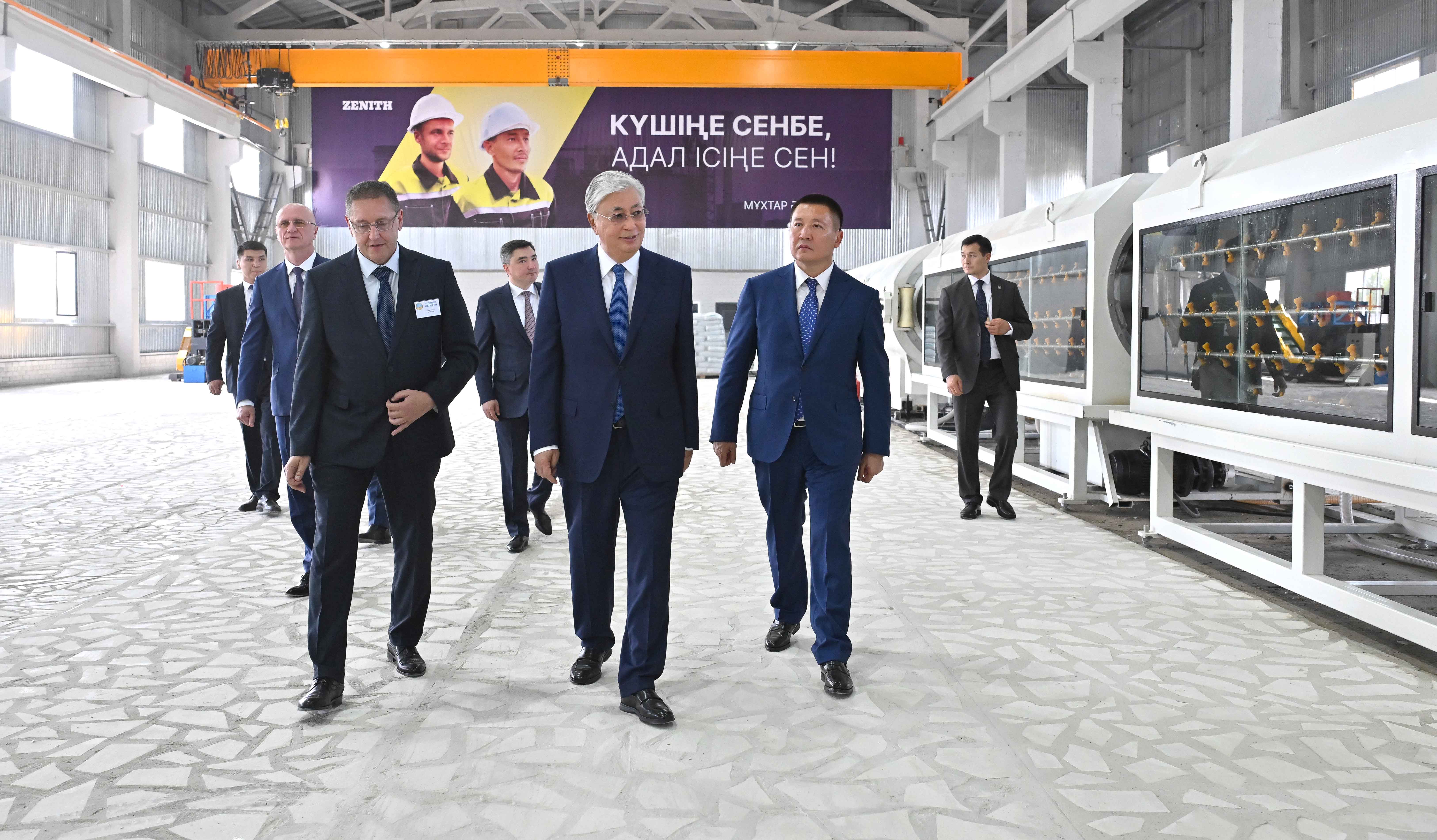 Қасым-Жомарт Тоқаев кәсіпорын цехтарын аралап, зауыт өнімдерімен танысты. Мұнда бетон, іргетас блоктары, кірпіш секілді құрылыс материалдары өндіріледі. Таяуда зауытта төмен қысымды полиэтиленнен диаметрі үлкен құбырлар шығаратын өндірістік желі іске қосылды. Өнім шаруашылық-ауызсу және техникалық сумен жабдықтау құбырларын салуда кеңінен қолданылады.