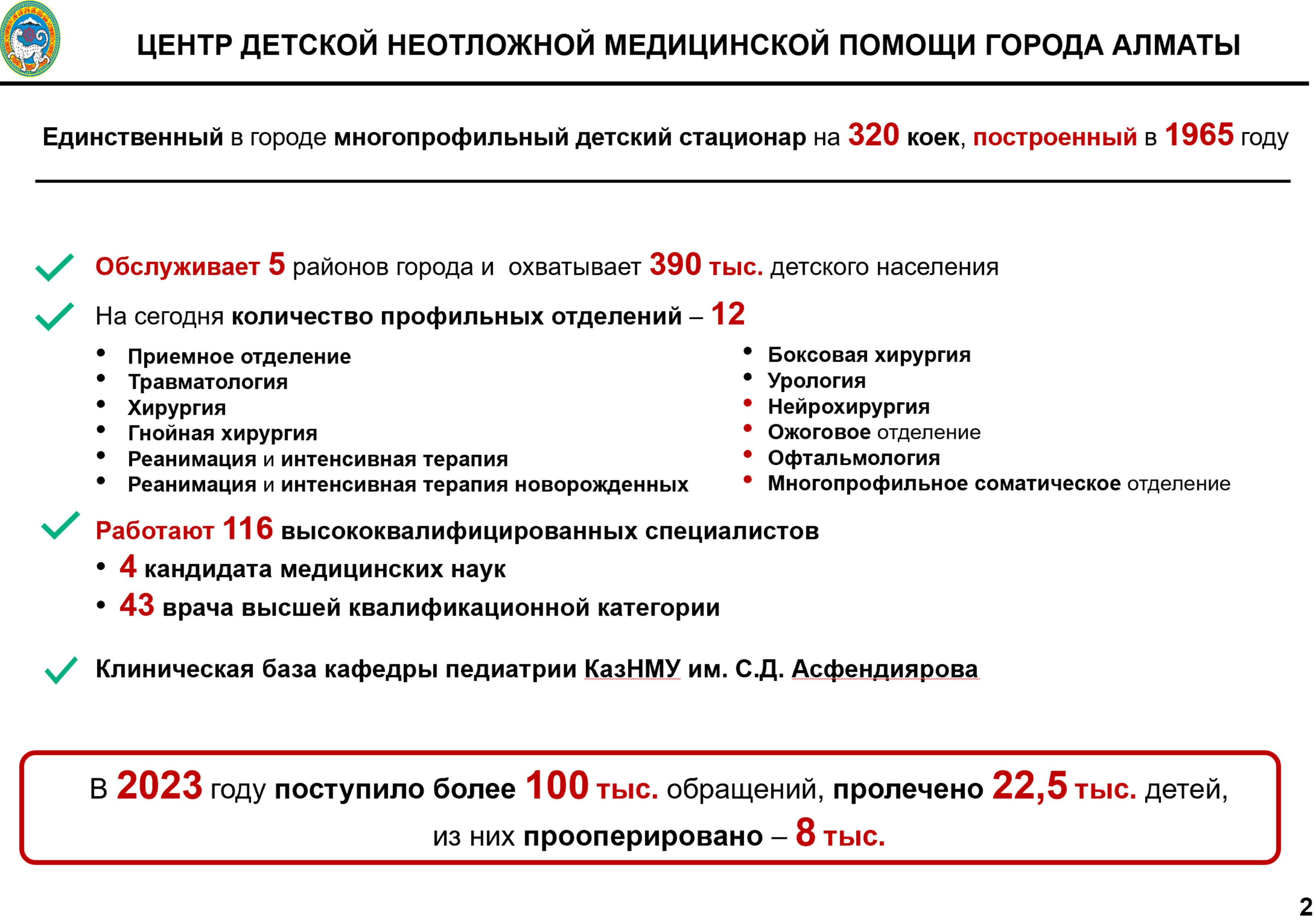 Алматы қаласы әкімінің орынбасары Әсем Нүсіпованың айтуынша, 1965 жылы негізі қаланған қалалық балалар ауруханасы С.Асфендияров атындағы Қазақ ұлттық медициналық университеті педиатрия кафедрасының клиникалық базасы саналады.