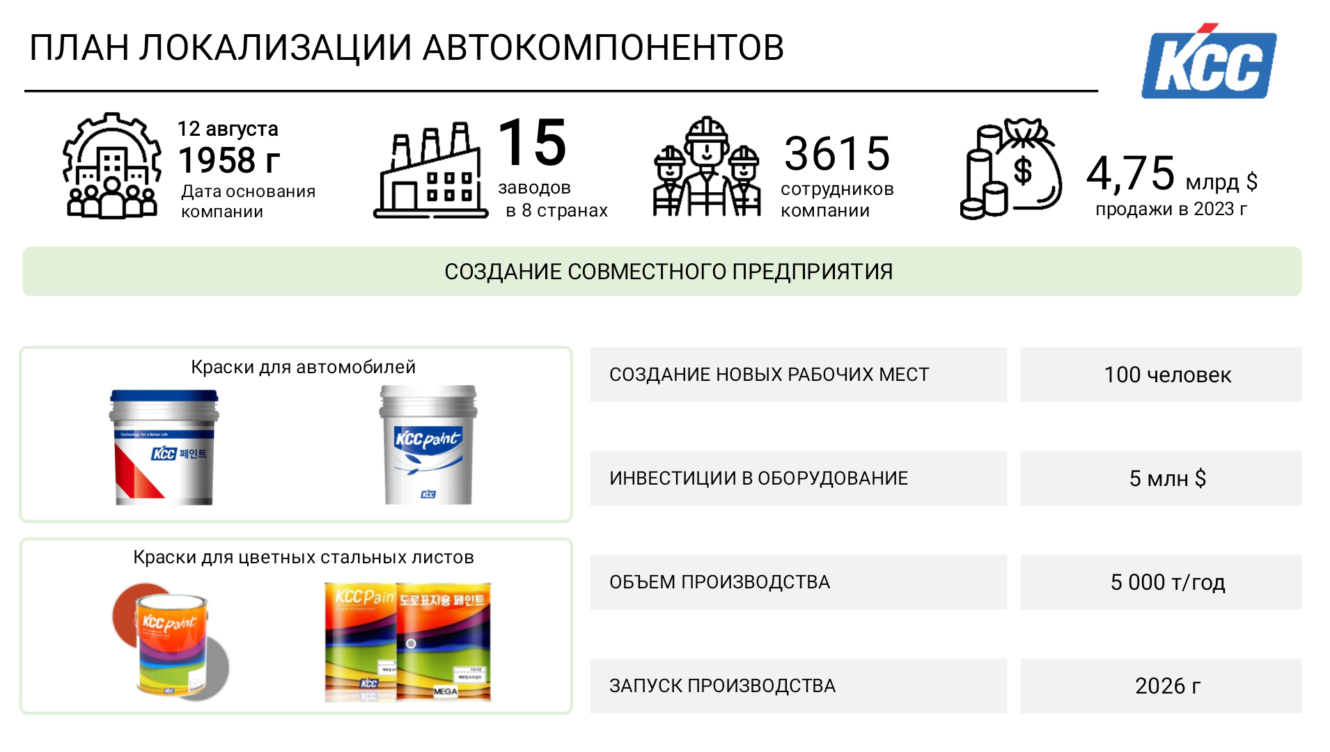 Қостанай қаласы Мемлекет басшысы Қасым-Жомарт Тоқаев Қостанай облысындағы KIA автомобильдерін шығаратын зауыттың құрылыс алаңына барды. Президентке құрылыс жұмыстары былтыр қазан айында басталғаны туралы баяндалды. Жоспарға сәйкес, конвейерден алғашқы көлік сынақ режимінде келесі жылдың шілде айында шығарылады. KIA Qazaqstan бас директоры Ким Дэ Ки зауыт 2025 жылдың қазан айында іске қосылатынын жеткізді. Автокәсіпорын бастапқы кезеңде Sorento моделін шығаруды жоспарлап отыр. 2026 жылдың қаңтар айынан бастап жаңартылған Sportage моделі құрастырылады. Президентке KIA зауыты жылына 70 мыңға жуық автокөлік шығара алатыны жөнінде мәлімет берілді. Кәсіпорында жаңадан 1500 тұрақты жұмыс орны ашылады. Мұнда өндірістің тиімділігін арттыруға әрі экологиялық тұрғыдан зиянсыз етуге бағытталған технологиялық шешімдер қолданылады. Автоматтандырылған заманауи кәсіпорынның дәнекерлеу желісінде, автокөлікті бояу және құрастыру жұмыстарына 70 робот пайдаланылады. Жобаның құны 200 миллион долларды құрайды, оның 80 пайызға жуығы тікелей шетелдік инвестицияның үлесінде. Сонымен қатар Қасым-Жомарт Тоқаевқа жаңа зауыттың жанынан қосалқы бөлшектер өндірісінің кластерін құру жобасы таныстырылды. Бүгінде Локализация орталығының құрылысы басталған. KIA компаниясы автокөлік компоненттері мен қосалқы бөлшектерін өндіруші жаһандық компанияларды тарту бойынша жұмыс жүргізіп жатыр. КСС Corporation компаниясы автокөлік компоненттері бөлімінің басқарушысы Пак Сэйон мен Seoyon Ehwa Global компаниясы жаһандық бизнесті басқару тобының жетекшісі Чанг Сэоквон Оңтүстік Кореяның өндірушілері Қазақстанда өз өндірісін ашуға әзір екенін айтты.