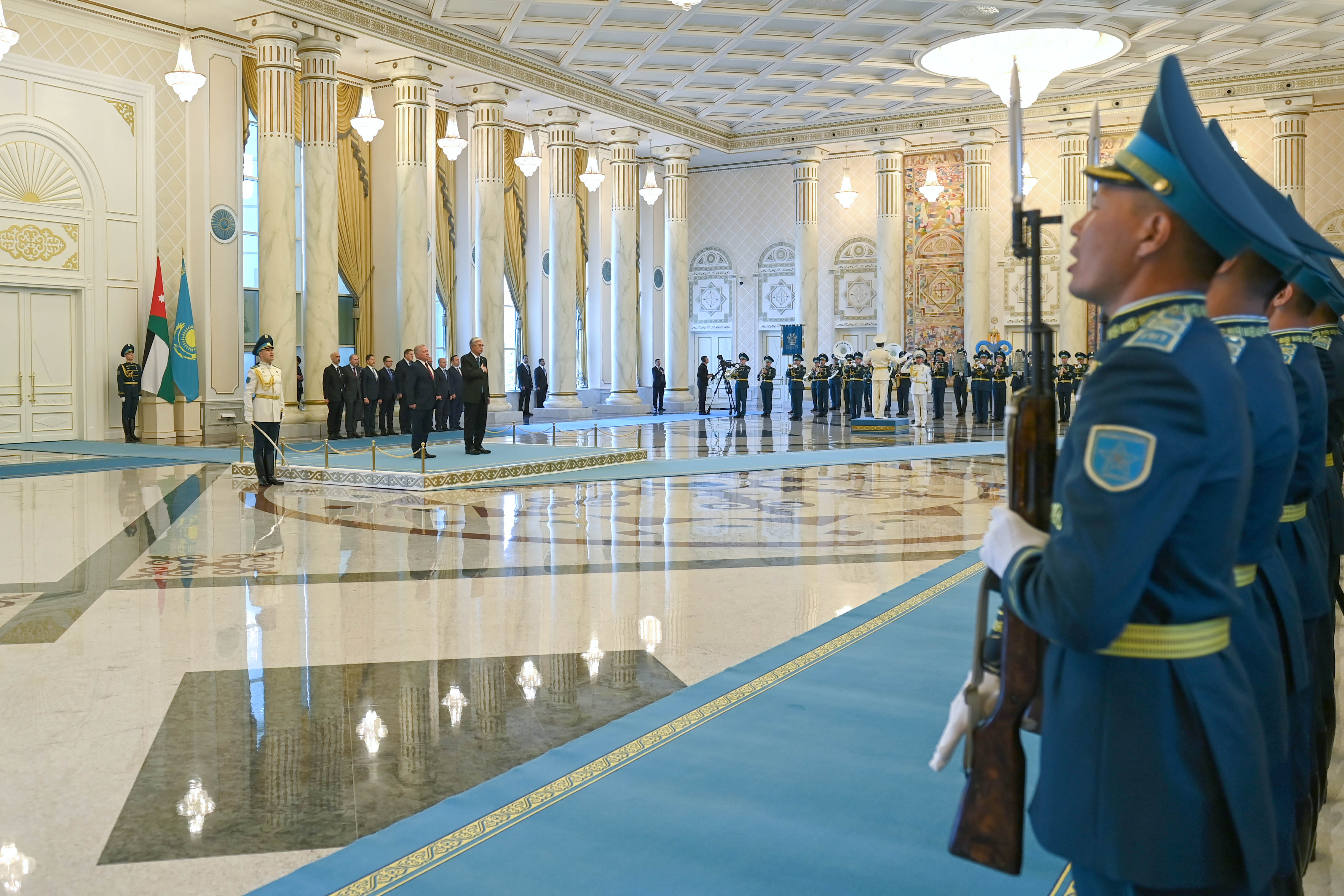 Касым-Жомарт Токаев и Абдалла II представили друг другу членов делегаций, после чего начальник роты почетного караула отдал приветственный рапорт, прозвучали гимны Казахстана и Иордании. Далее главы государств направились в зал переговоров.