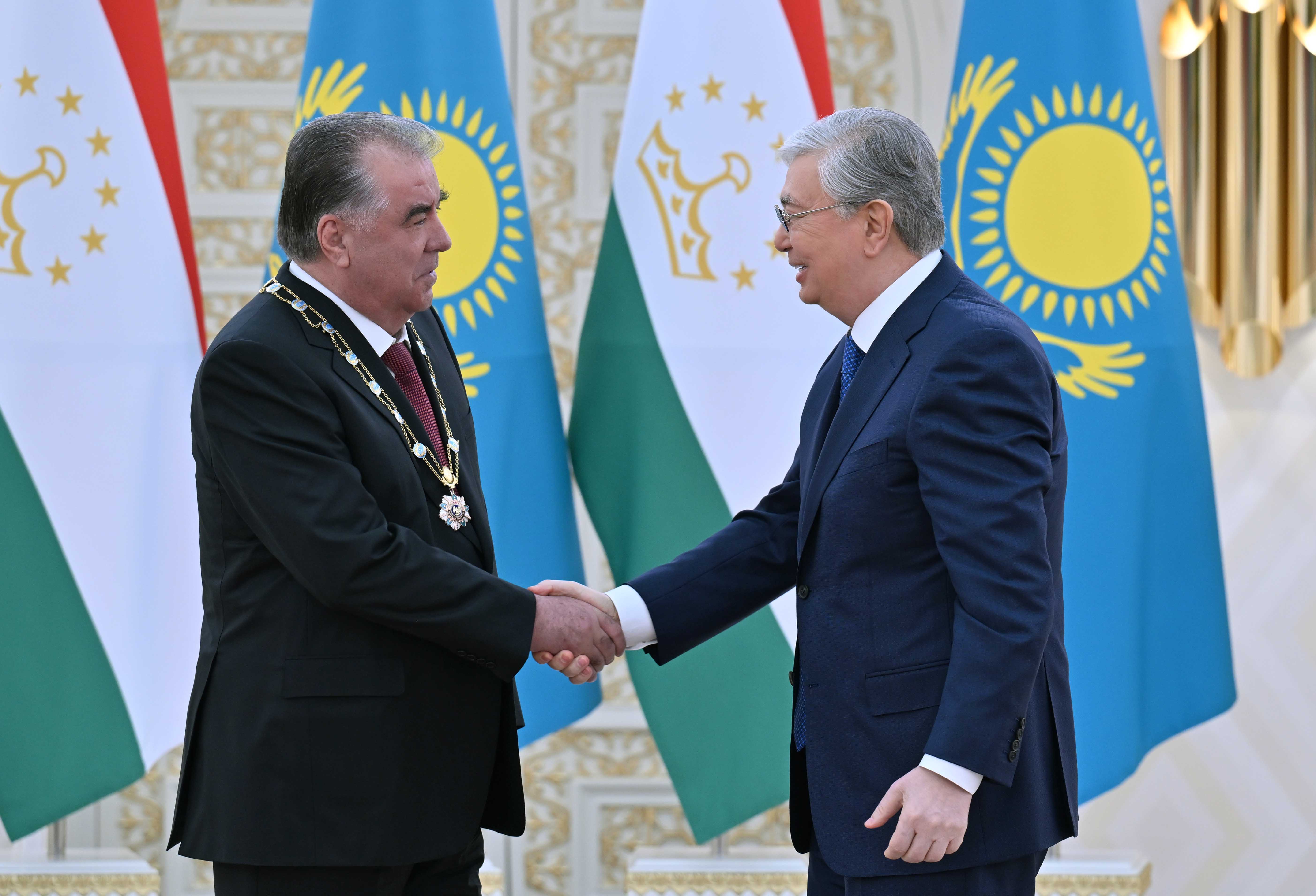 Президент Касым-Жомарт Токаев вручил находящемуся в Астане с визитом Президенту Таджикистана Эмомали Рахмону высшую государственную награду Республики Казахстан – орден «Алтын Қыран».