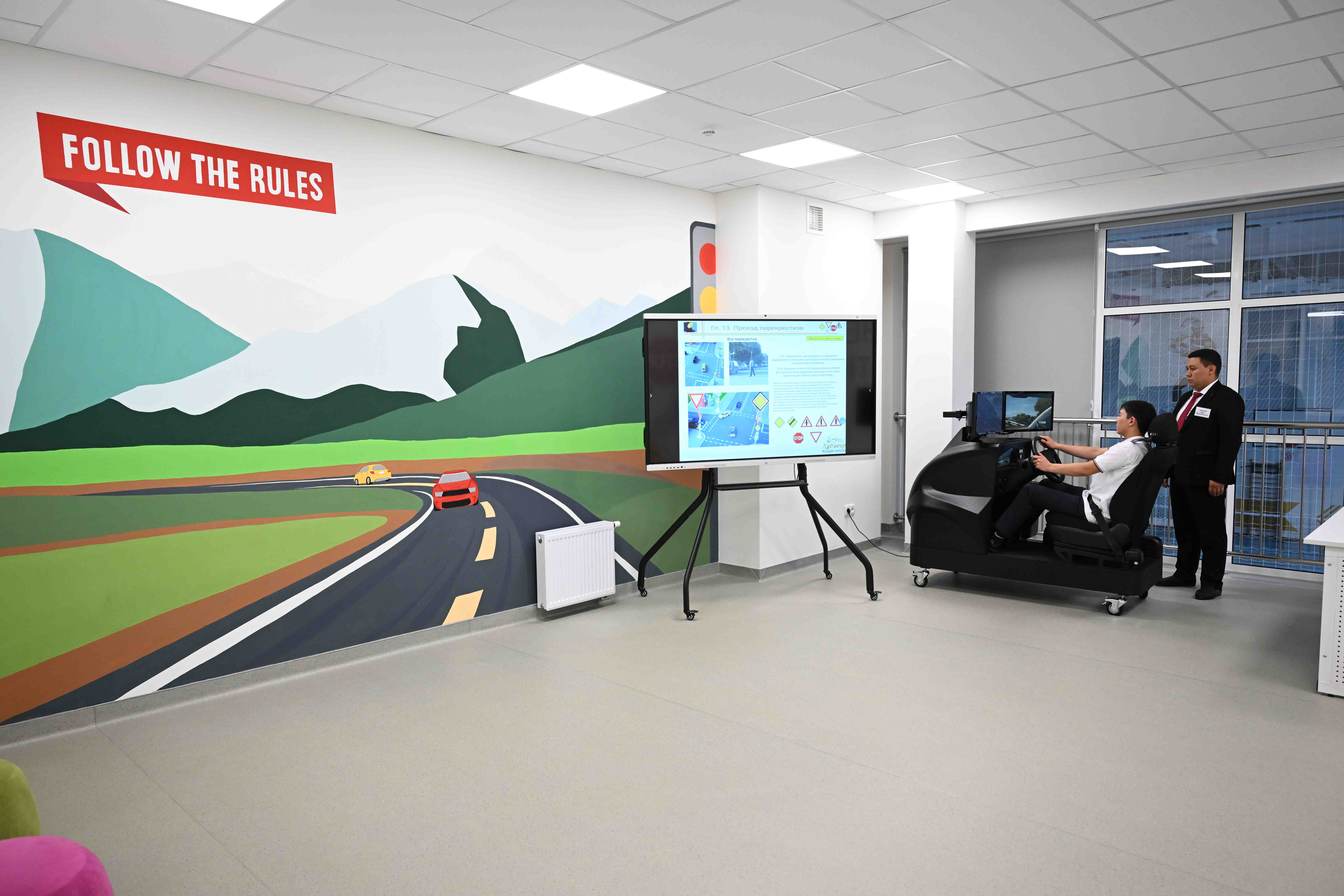 Глава государства осмотрел кабинеты робототехники, мобилографии, виртуального обучения вождению автомобиля, иностранных языков, школьную библиотеку. Затем он побеседовал с педагогами и учащимися.