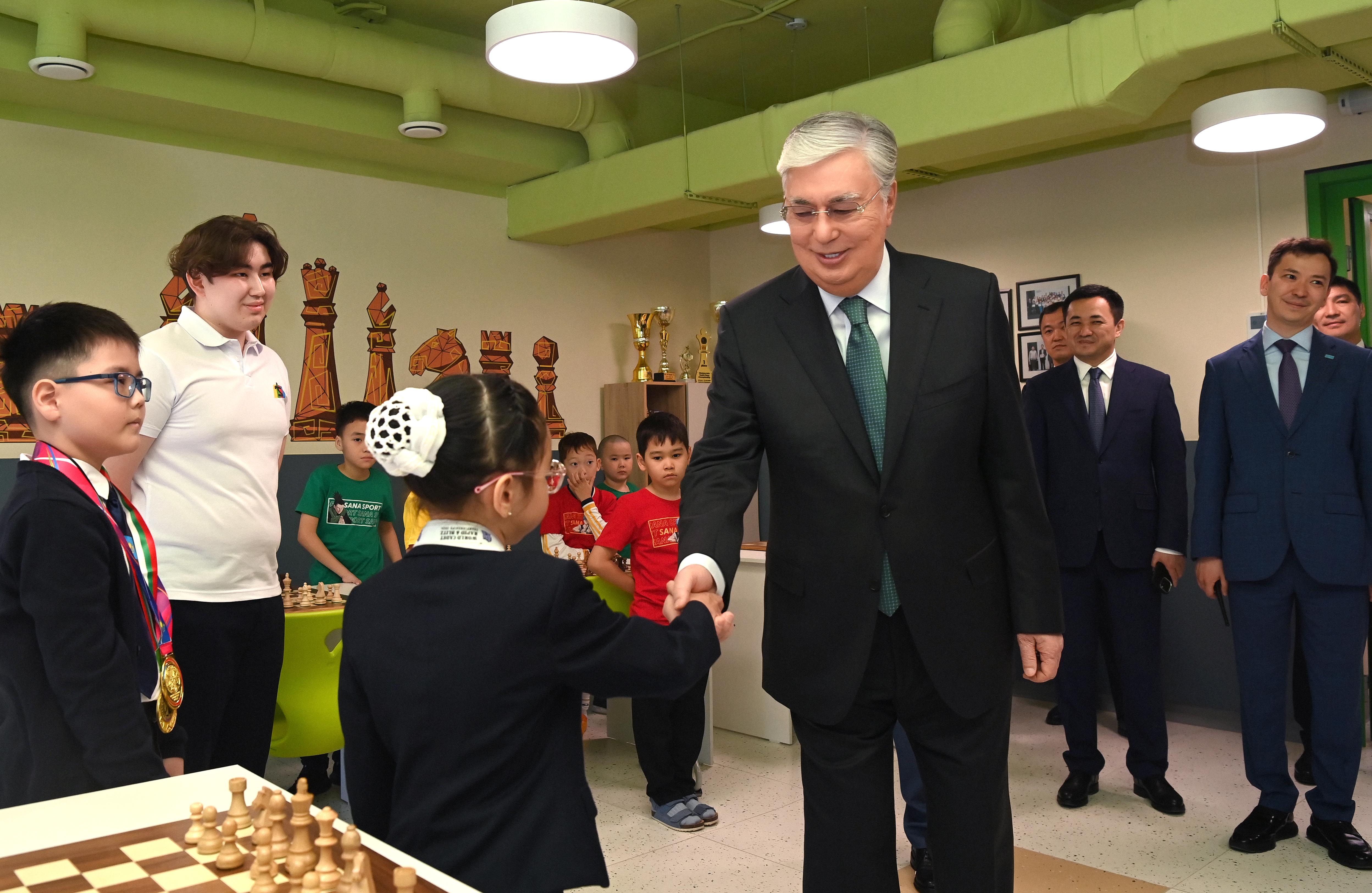 Касым-Жомарт Токаев осмотрел спортивные залы, творческие кружки и учебные кабинеты. Президент вручил подарок двукратной чемпионке мира по шахматам Айару Алтынбек, которая проводит здесь мастер-класс, и пожелал ей новых побед. Юная шахматистка недавно написала письмо к Главе государства с просьбой о встрече, и сегодня ее мечта исполнилась.