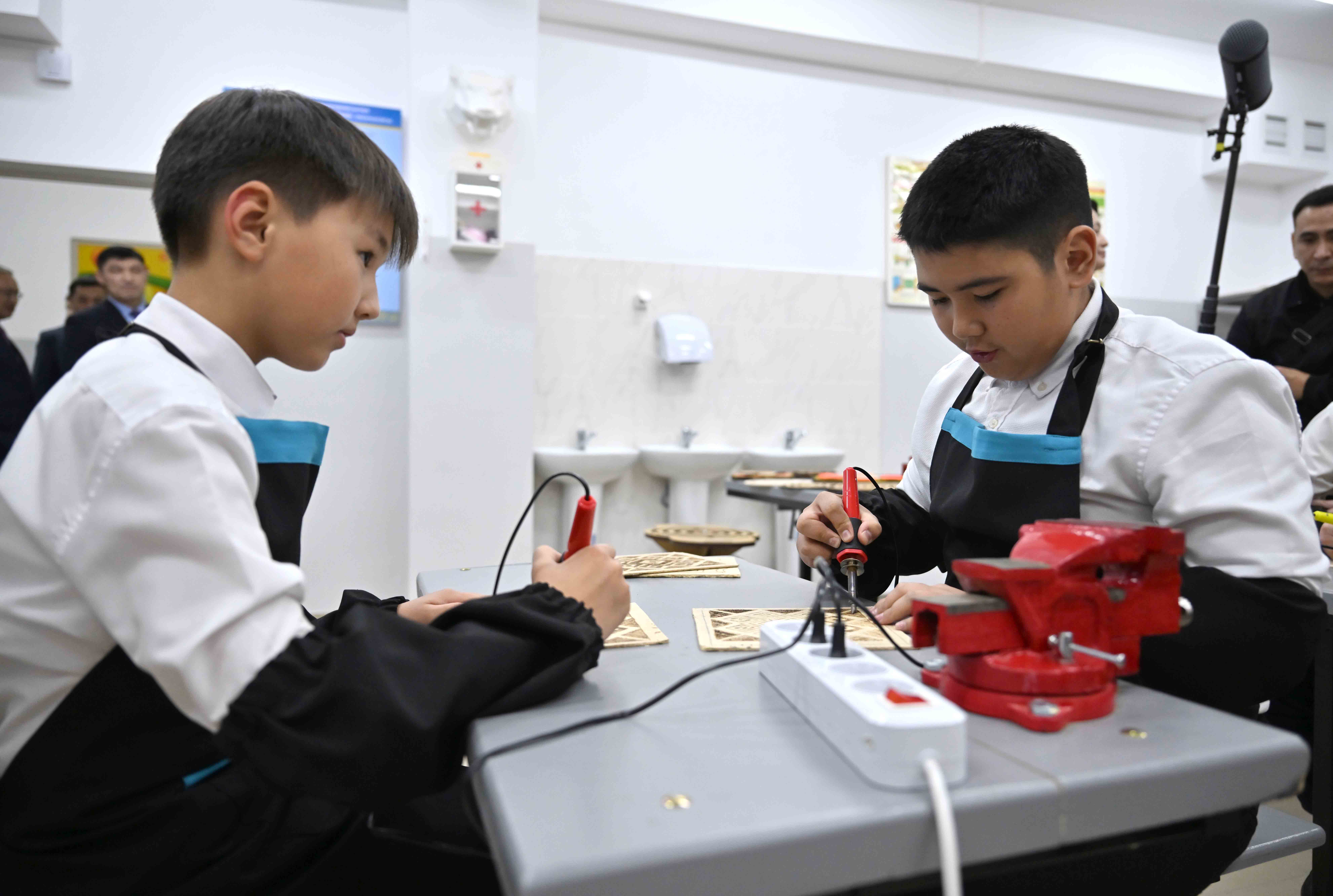 Президент осмотрел учебное заведение и побеседовал с учениками. Глава государства подарил образовательному учреждению школьный автобус.
