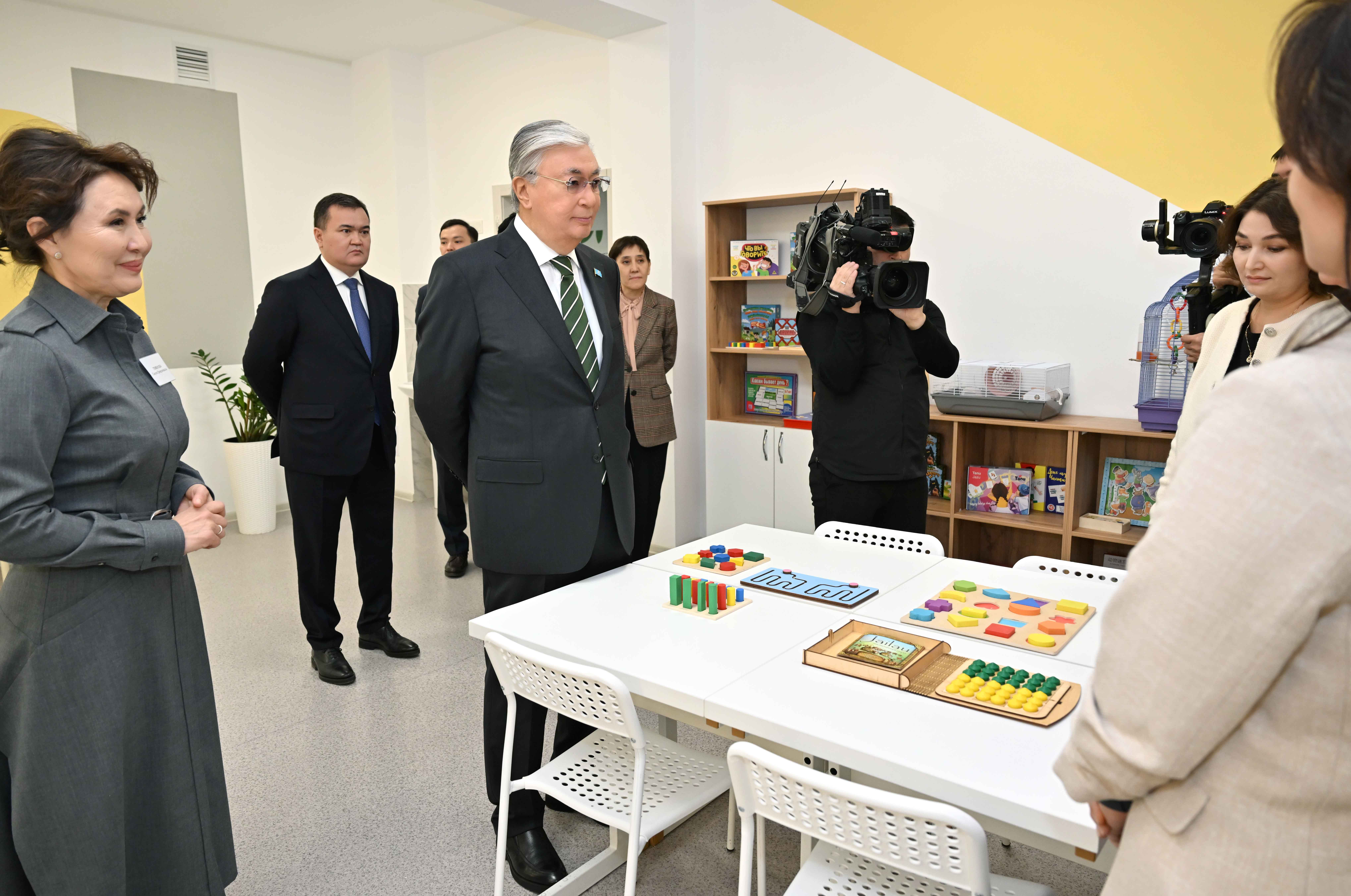 Глава государства осмотрел спортивный зал, кабинет робототехники и пообщался с учениками.