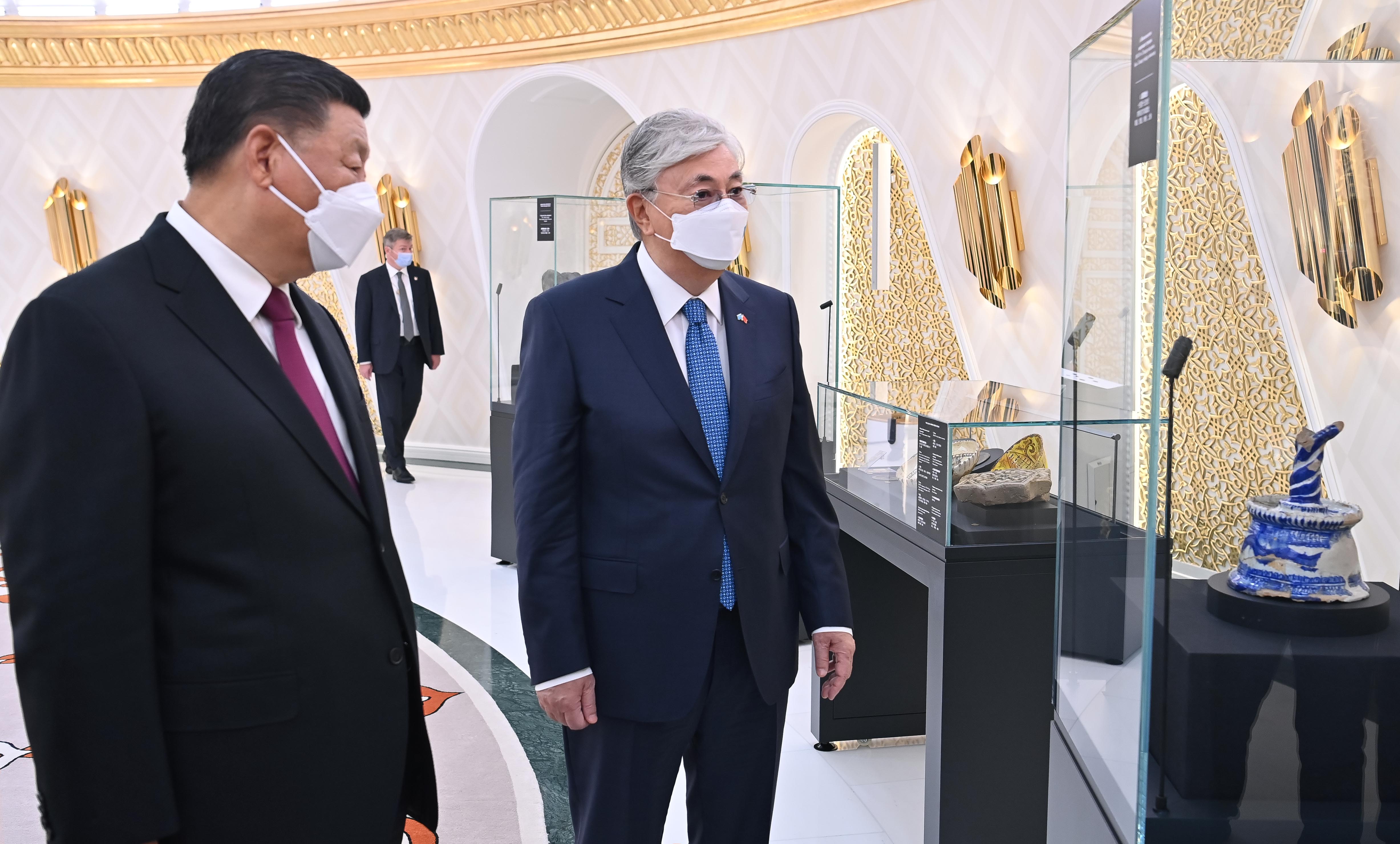 После завершения официальных переговоров главы государств осмотрели выставку «Казахстан – Китай: Диалог тысячелетий», которая демонстрирует глубокие историко-культурные связи двух стран с древних времен до современности.