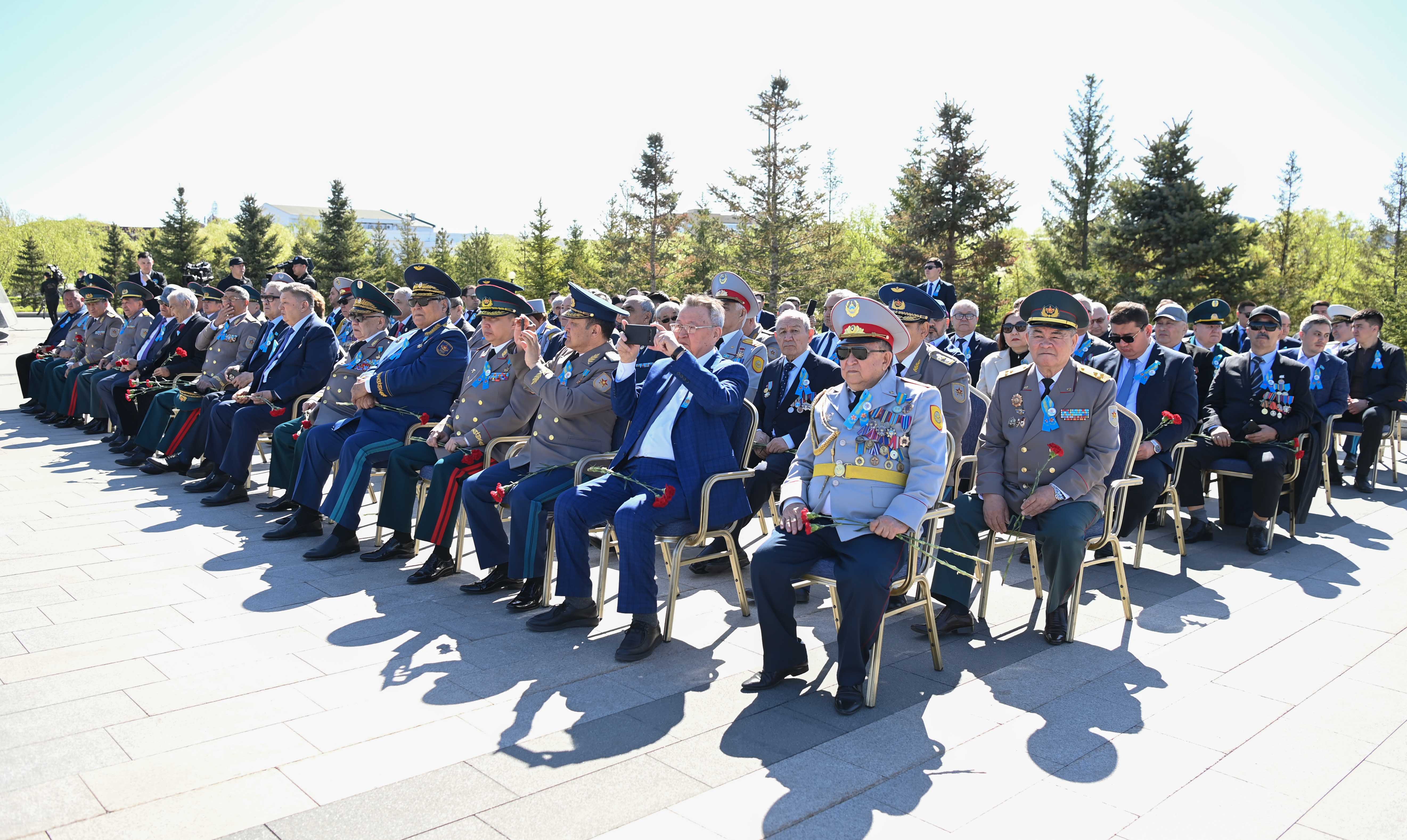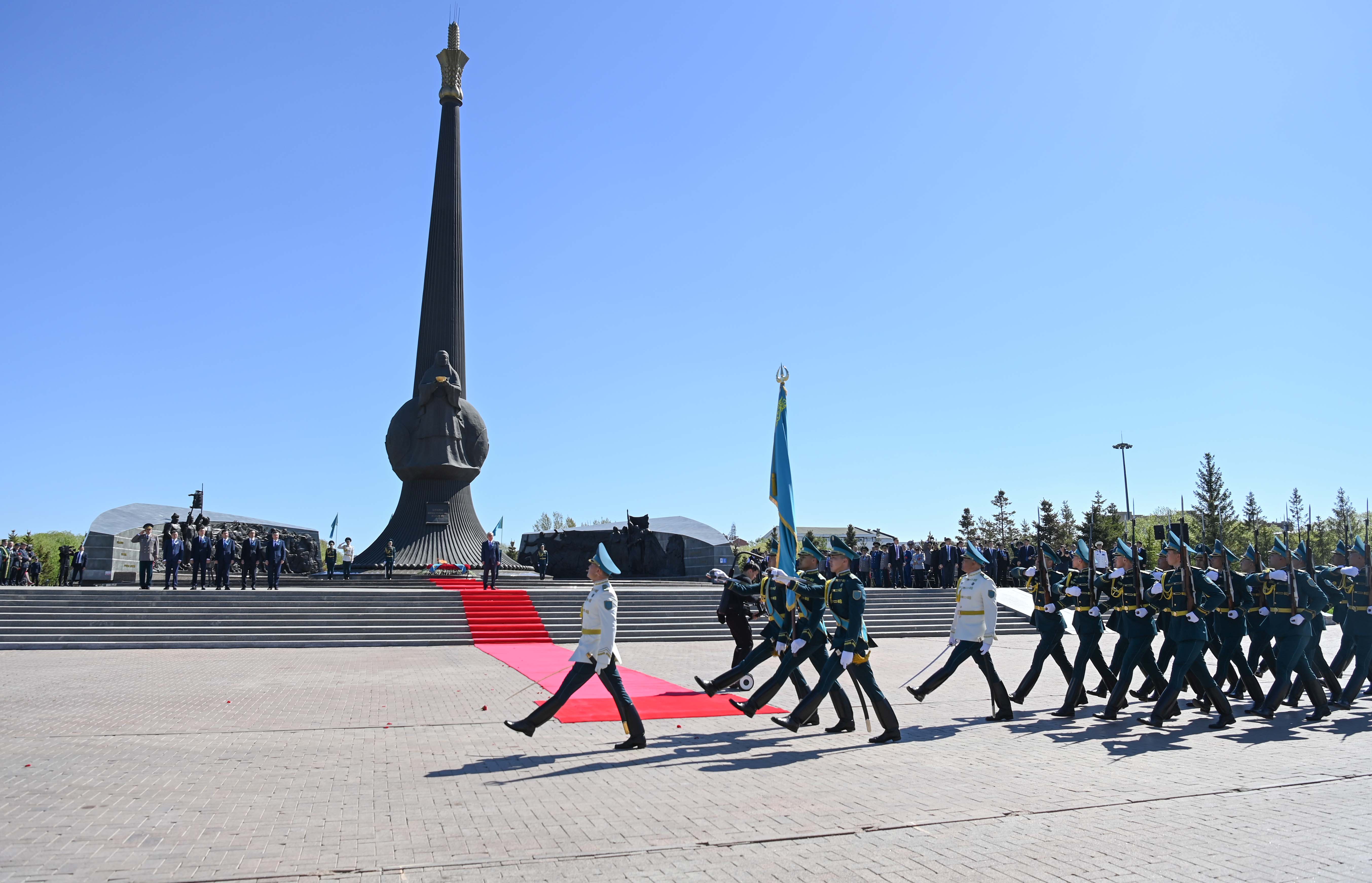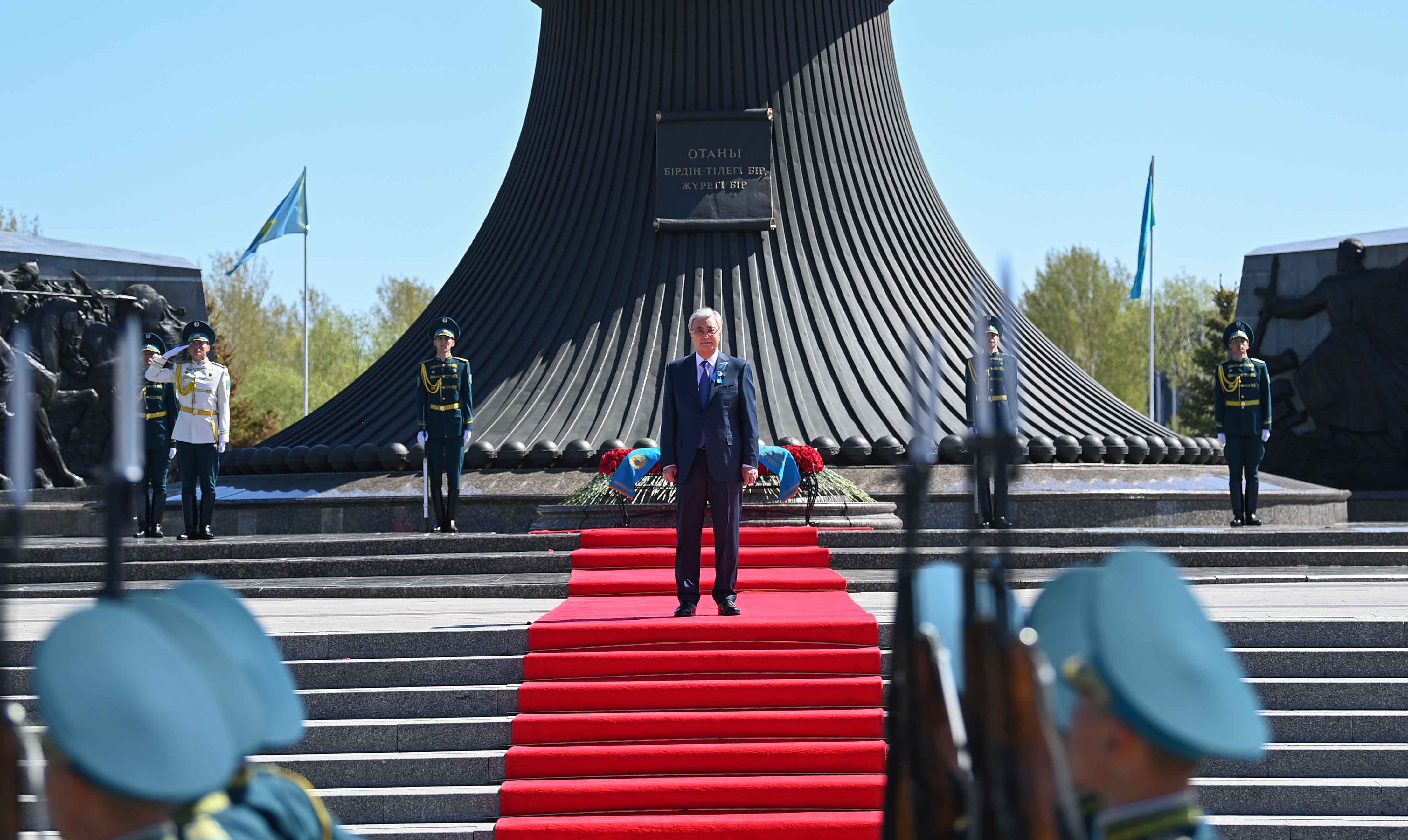 Глава государства возложил цветы к монументу «Отан Ана» и почтил минутой молчания память воинов-казахстанцев, погибших в годы Великой Отечественной войны. Затем президентский оркестр исполнил Государственный Гимн, рота почетного караула прошла торжественным маршем перед участниками мероприятия.