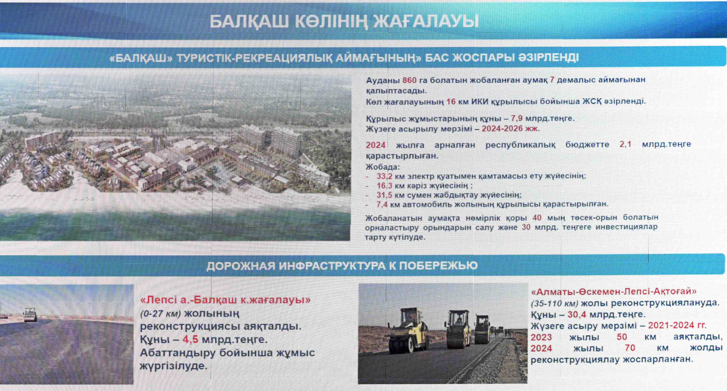 Кроме того, разработан «Генеральный план туристско-рекреационной зоны «Балхаш». За счет бюджета на побережье протяженностью 16 километров будет проведена инженерно-коммуникационная сеть, на общей площади 860 гектаров будут размещены зоны отдыха по 7 направлениям. Предусмотрено привлечение частных инвестиций до 30 миллиардов тенге. Также в следующем году планируется завершить реконструкцию дороги «Алматы – Усть-Каменогорск – Лепсы-Актогай», которая ведет к озеру.