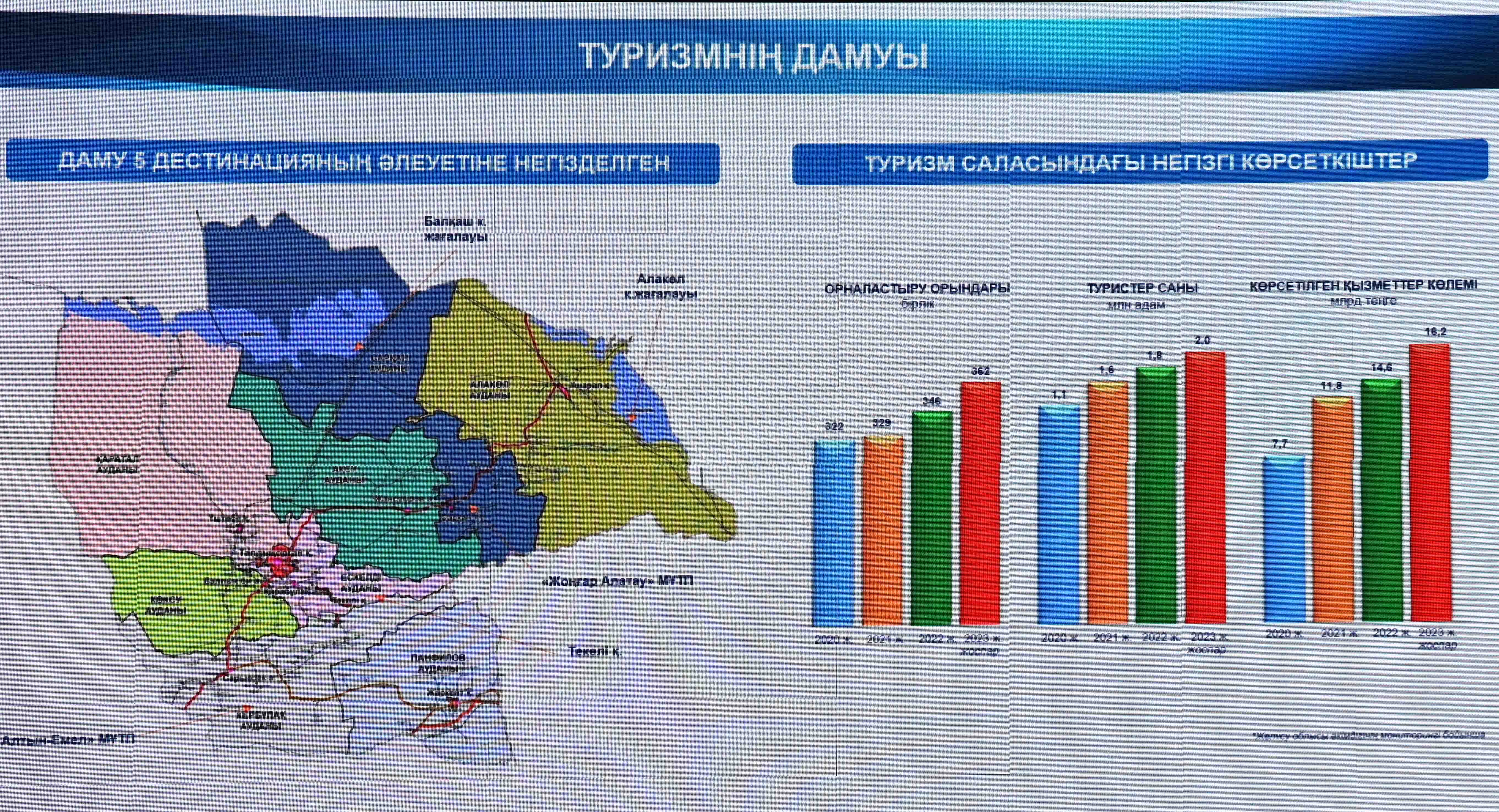 Продвижение экологического туризма является приоритетом в Жонгар-Алатауском национальном природном парке и национальном природном парке «Алтын-Эмель». В этом году был открыт визит-центр Altynemel, а на территории Жонгар-Алатауского национального парка планируется реализовать 8 инвестиционных проектов на общую сумму 1,7 миллиарда тенге.