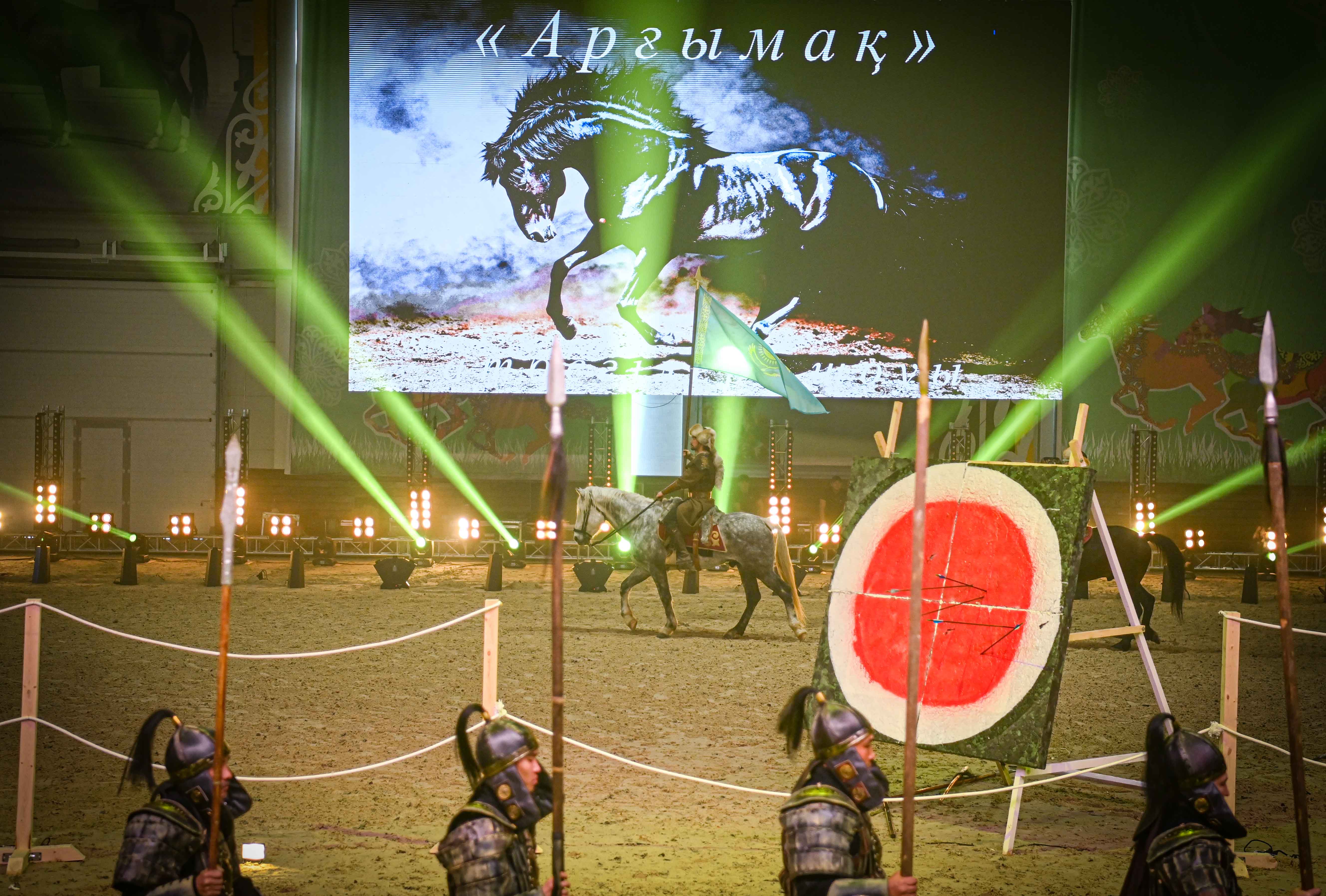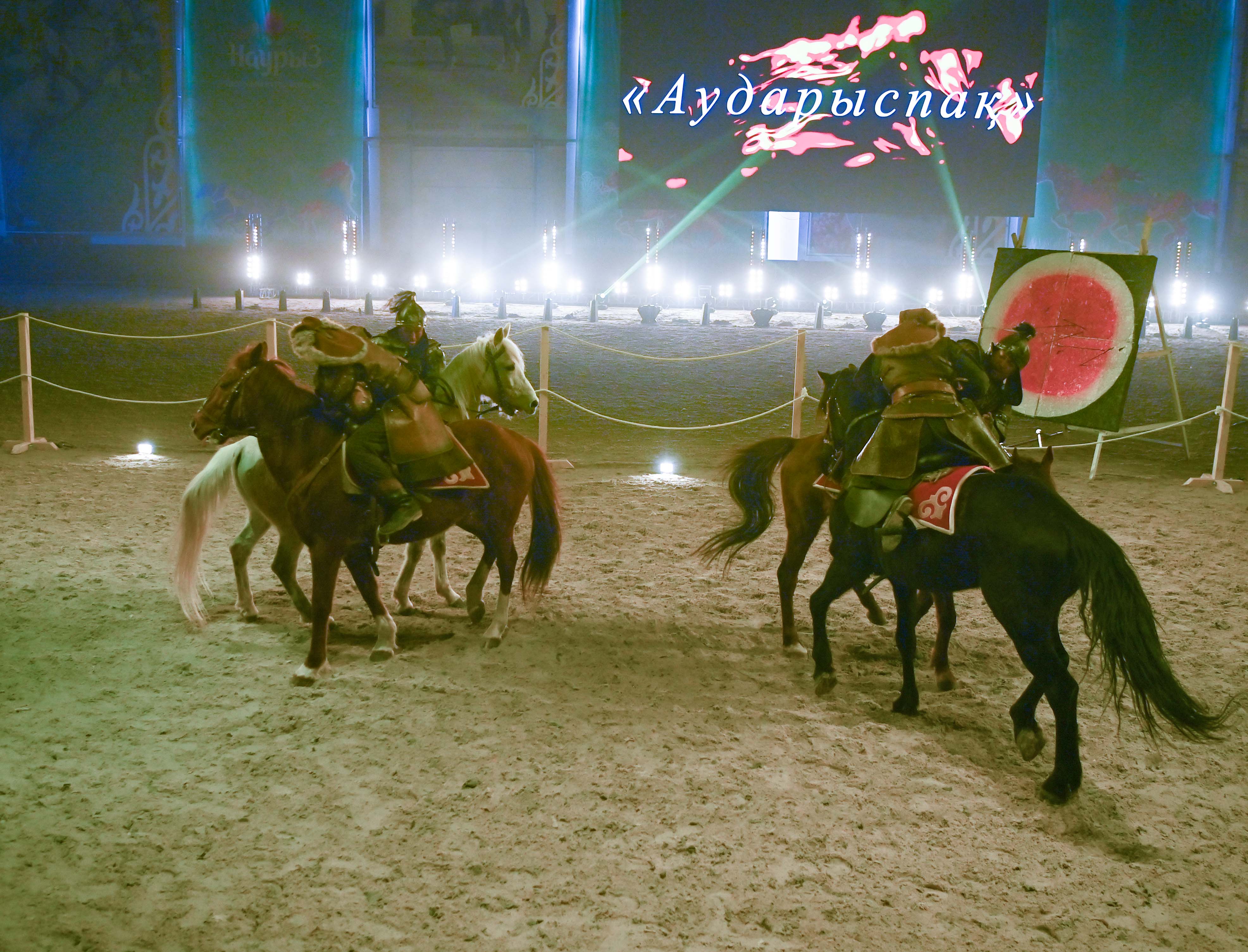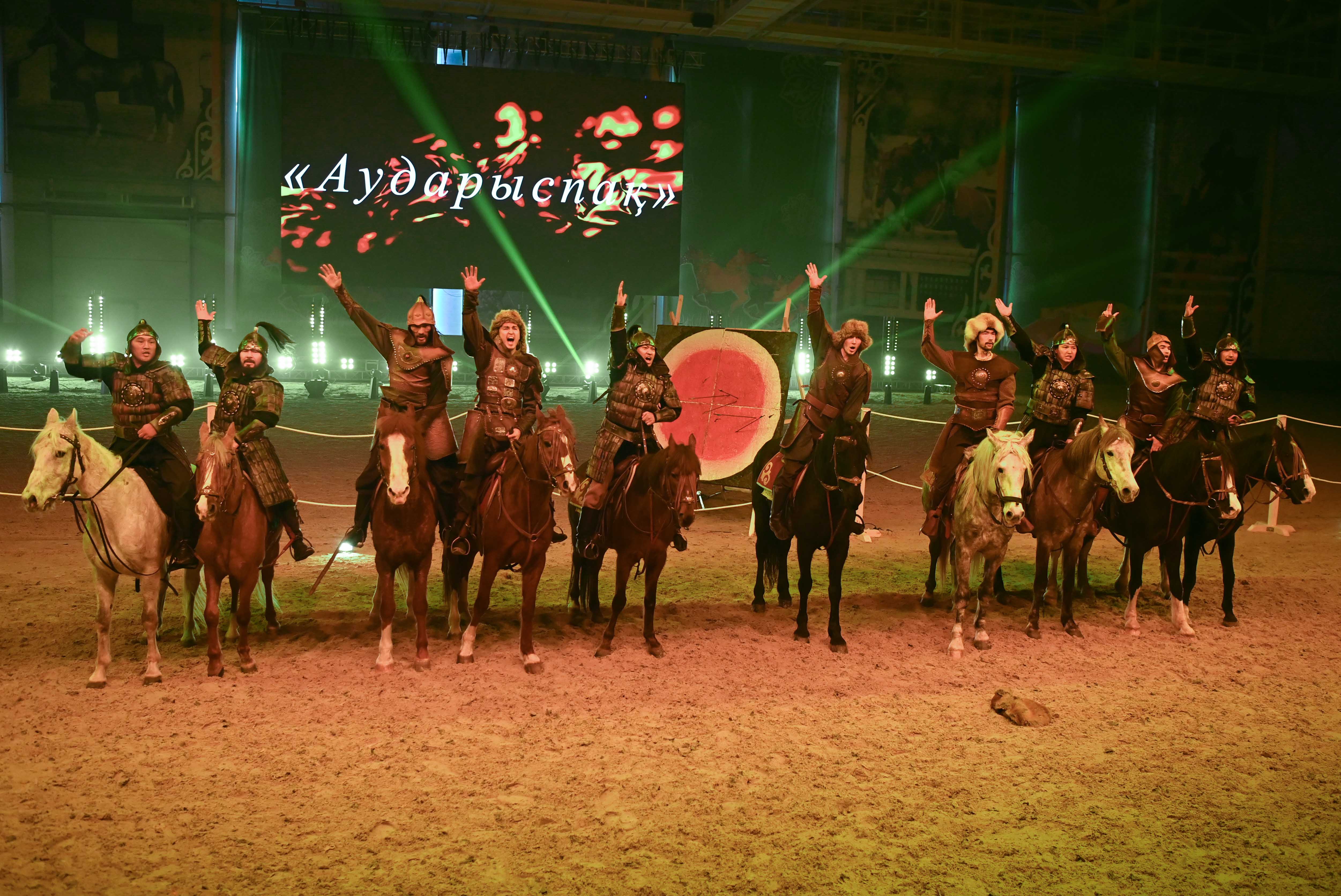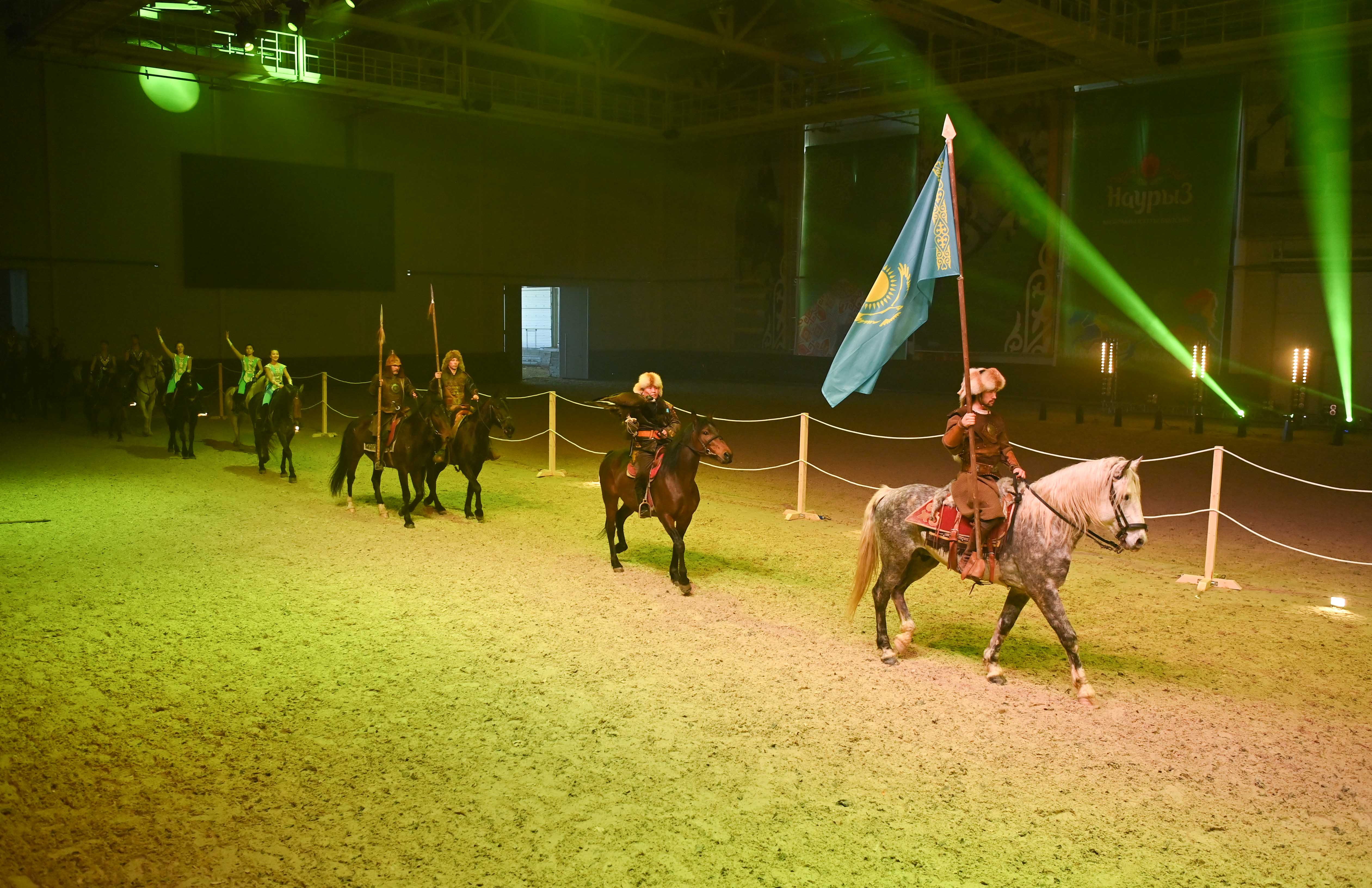 Касым-Жомарту Токаеву показали шоу конных наездников Nomad Stunts. Каскадеры продемонстрировали казахские национальные игры – аударыспақ, қыз қуу, теңге ілу, садақ ату, а также парад номадов.