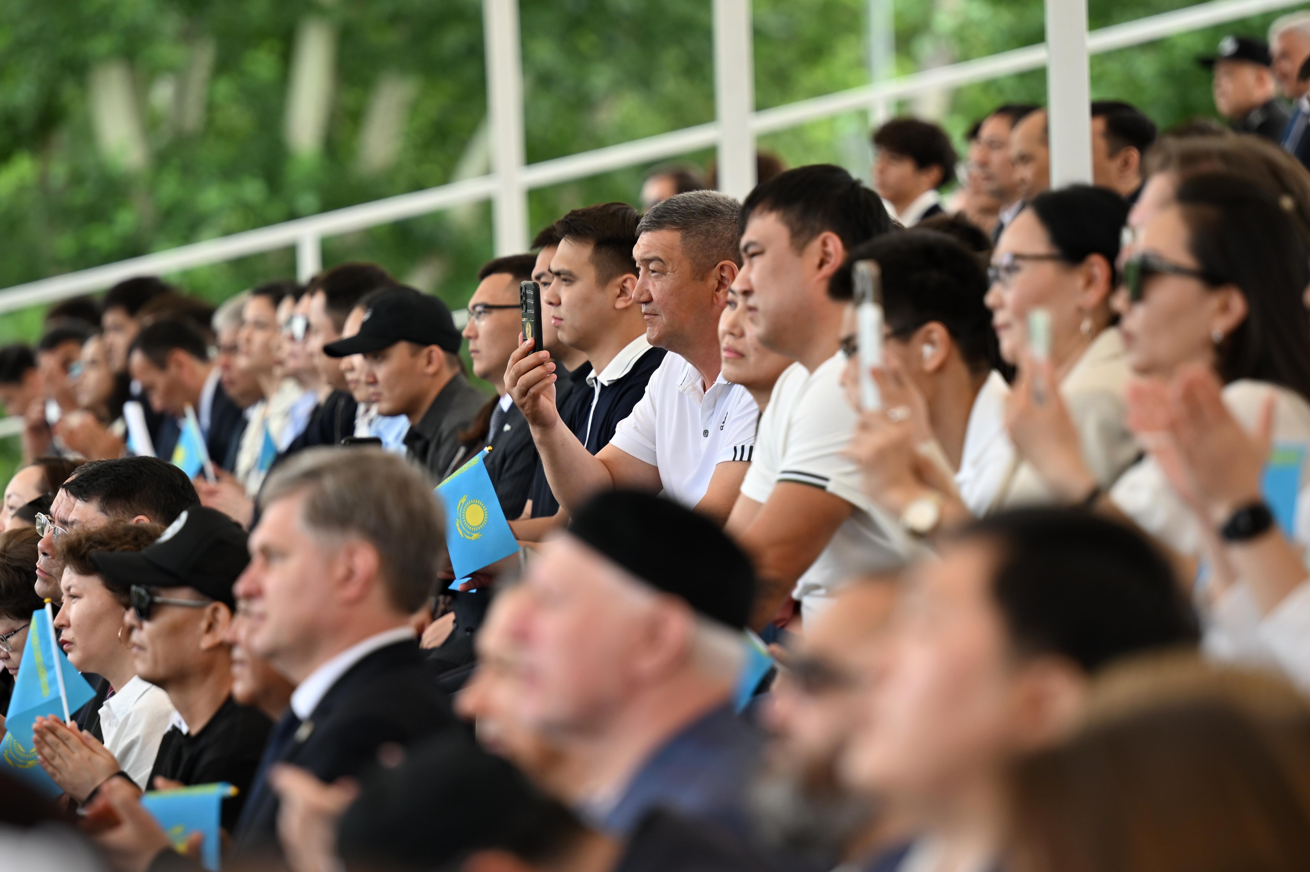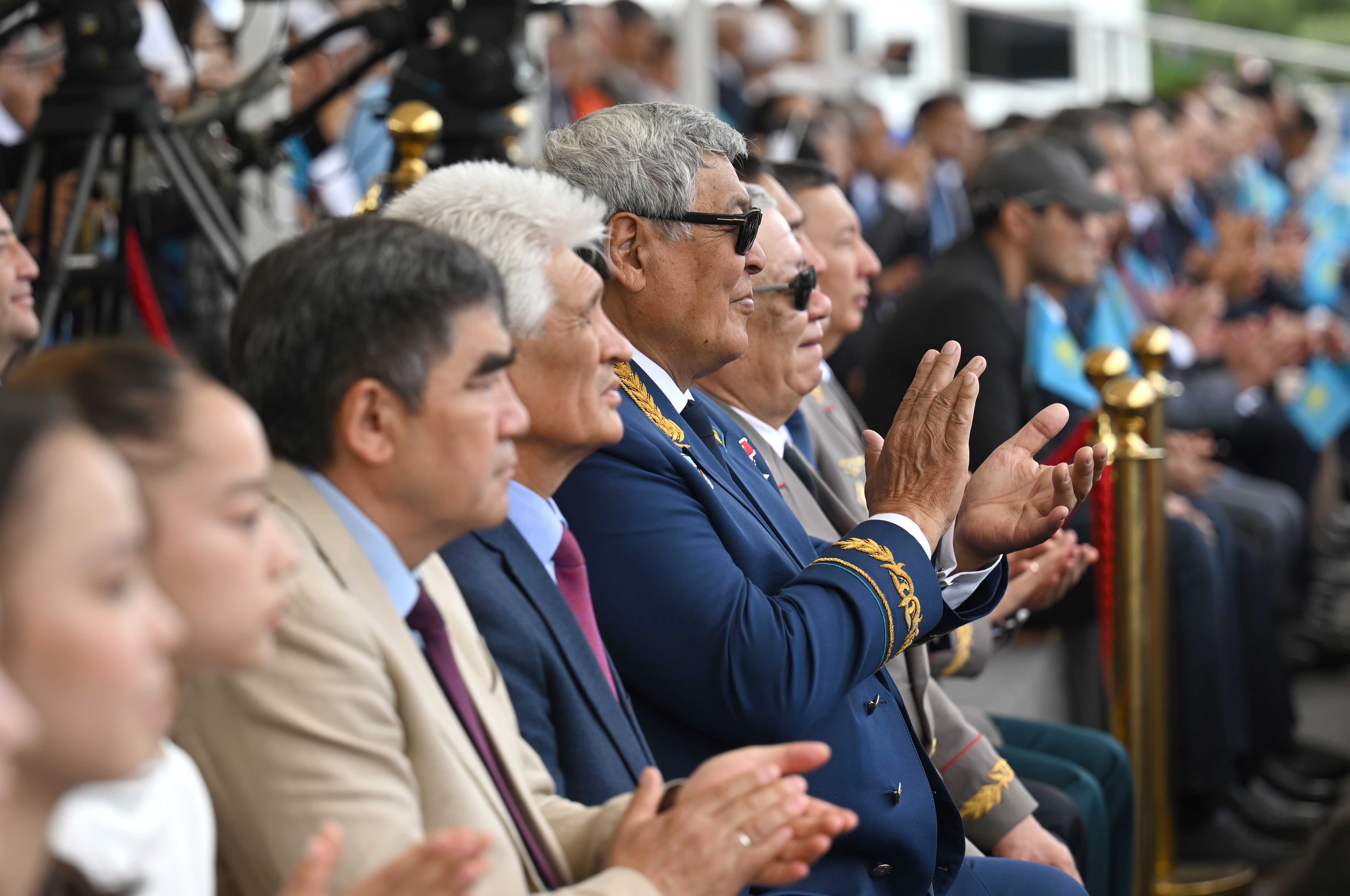 В мероприятии приняли участие руководители государственных органов, депутаты Парламента, члены Национального курултая, обладатели званий «Халық Қаһарманы» и «Қазақстанның Еңбек Ері», курсанты высших военных учебных заведений и их родственники.
