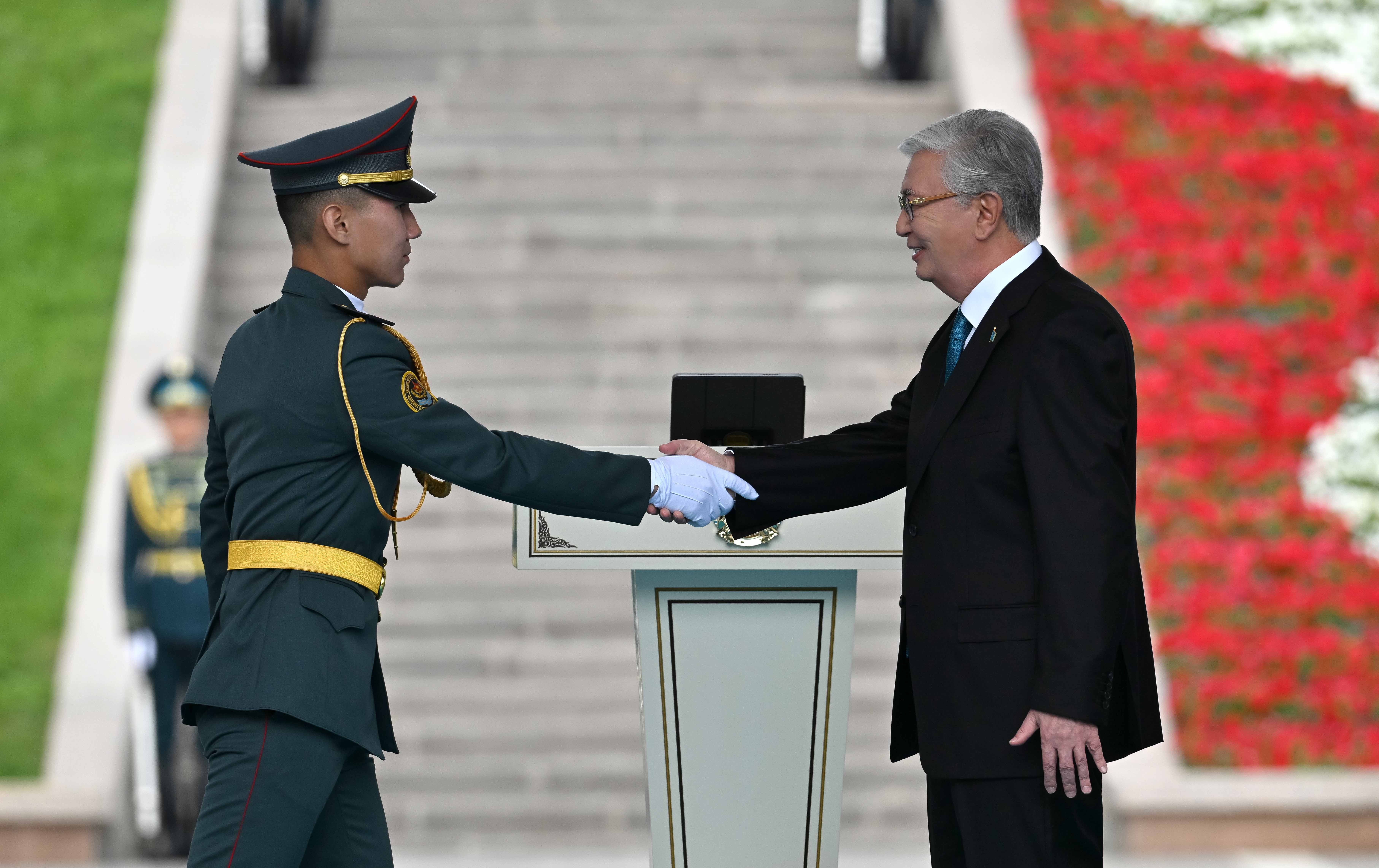 – Доброй традицией стало вручение офицерских погонов лучшим курсантам под нашим небесно-голубым знаменем, которое воодушевляет и укрепляет патриотический дух воинов. В такие моменты каждый гражданин глубже осознает, что служение родной стране – это его сыновний долг, что он является потомком отважных батыров, доблестно защищавших нашу Отчизну. Военнослужащие, стоящие на страже рубежей государства, достойно продолжают славные традиции храбрых предков. Уверен, вы всегда будете высоко держать священный флаг нашей страны. Пусть гордо реет наш небесно-голубой стяг! Мира и благополучия нашей Родине! – пожелал Глава государства.