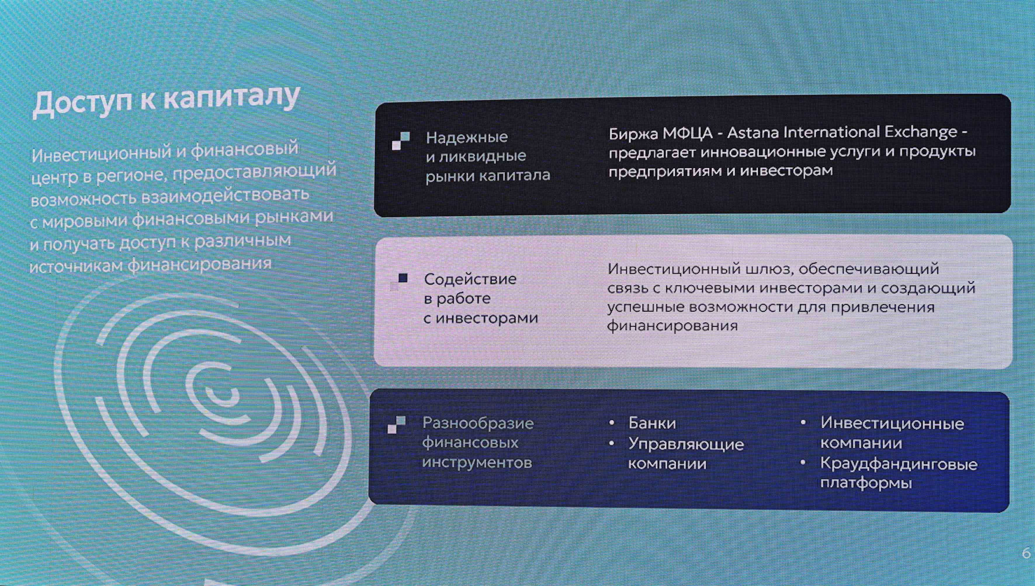 Объем привлеченных через МФЦА инвестиций в экономику Казахстана превышает 13 млрд долларов США, из них 5,9 млрд – портфельные инвестиции на бирже AIX и 7,3 млрд – инвестиции компаний – участников МФЦА. Сегодня здесь работают порядка 3200 компаний из более чем 80 стран мира. В их числе и 6 крупных компаний из Армении, которые специализируются в сферах информационно-коммуникационных технологий, финансовых услуг и страхования.